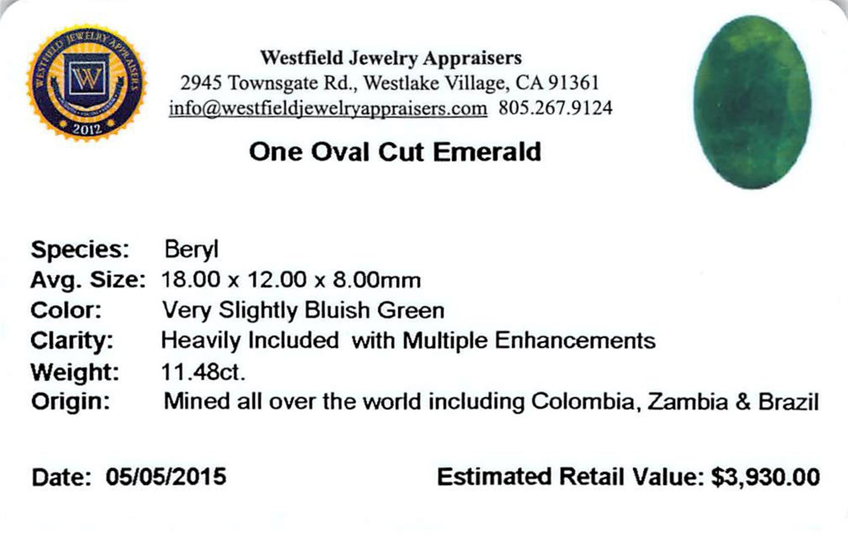 One oval cut natural emerald, measuring 18.00 x 12.00 x 8.00mm, exact weight 11.48ct., clarity is moderately included, type III, medium dark, very slightly grayish, very slightly bluish green color, (GIA vslbG 6/3), cut is good. Indications of multiple laboratory enhancements, including high temperature heat treatment._x000D_ Westfield Appraised at $3,930.00.