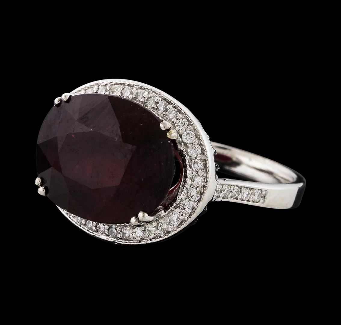 One Ruby and Diamond Ring featuring: 14KT White Gold with a total weight of 5.04 grams, One Ruby stone with a total weight of 11.48ct, and 44 Diamonds with a total weight of 0.34ctw.