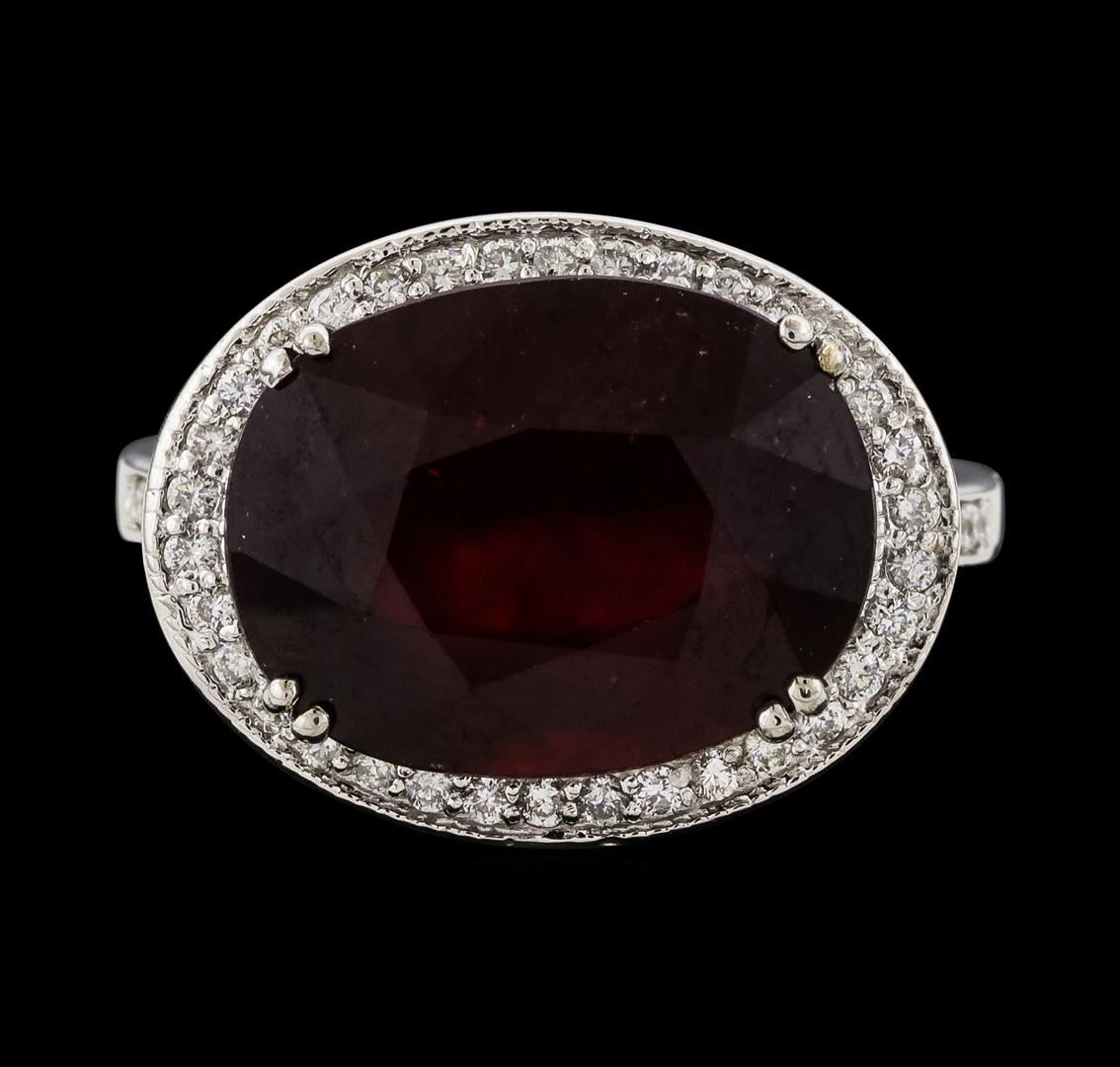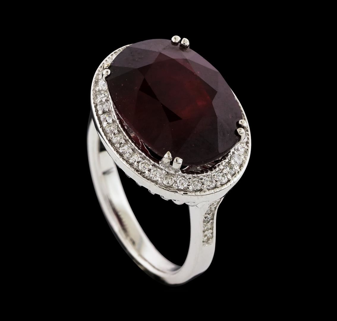 One Ruby and Diamond Ring featuring: 14KT White Gold with a total weight of 5.04 grams, One Ruby stone with a total weight of 11.48ct, and 44 Diamonds with a total weight of 0.34ctw.