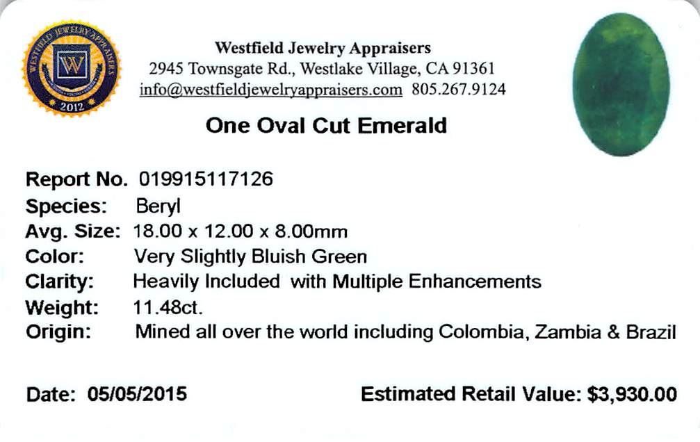 One oval cut natural emerald, measuring 18.00 x 12.00 x 8.00mm, exact weight 11.48ct., clarity is moderately included, type III, medium dark, very slightly grayish, very slightly bluish green color, (GIA vslbG 6/3), cut is good. Indications of multiple laboratory enhancements, including high temperature heat treatment. Westfield Appraised at $3,930.00.