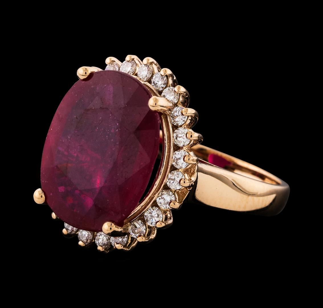 One electronically tested 14KT rose gold lady's cast fashion ring with a basket halo with a bright polish finish. The featured lady's ring has a shank measuring 2.70 millimeters wide. Identified with markings of '14K'. Condition is new, good workmanship. Containing: One prong set oval modified brilliant cut natural ruby, measuring 16.20 x 13.59 x 5.03mm, (depth est.) 10%. bulge factor, approximate weight of 11.51ct., clarity is heavily included, medium dark, very slightly brownish, slightly purplish red color, (GIA slpR 6/3), cut is good. Transmitting light somewhat diffusely, transparent to translucent. Naturally occurring internal & external characteristics are present. Indications of laboratory high temperature heat treatment, with glass & flux additives. Colored gemstones are presumed to have been subjected to commonly used enhancement processes. Graded in the setting. Twenty-Four prong set round brilliant cut diamonds, measuring 2.00 - 1.90 x 1.21mm (depth est.) approximate total weight of 24 Stones = 0.67ct. Graded in the setting. Clarity SI-1 to I-1. Color: H - I Cut Good. Total Weight of Colored Stones 11.51ct.. Total Weight of Diamonds 0.67ct.. Total Weight of Ring 8.90gm. GAS Appraised at $6,750.00.