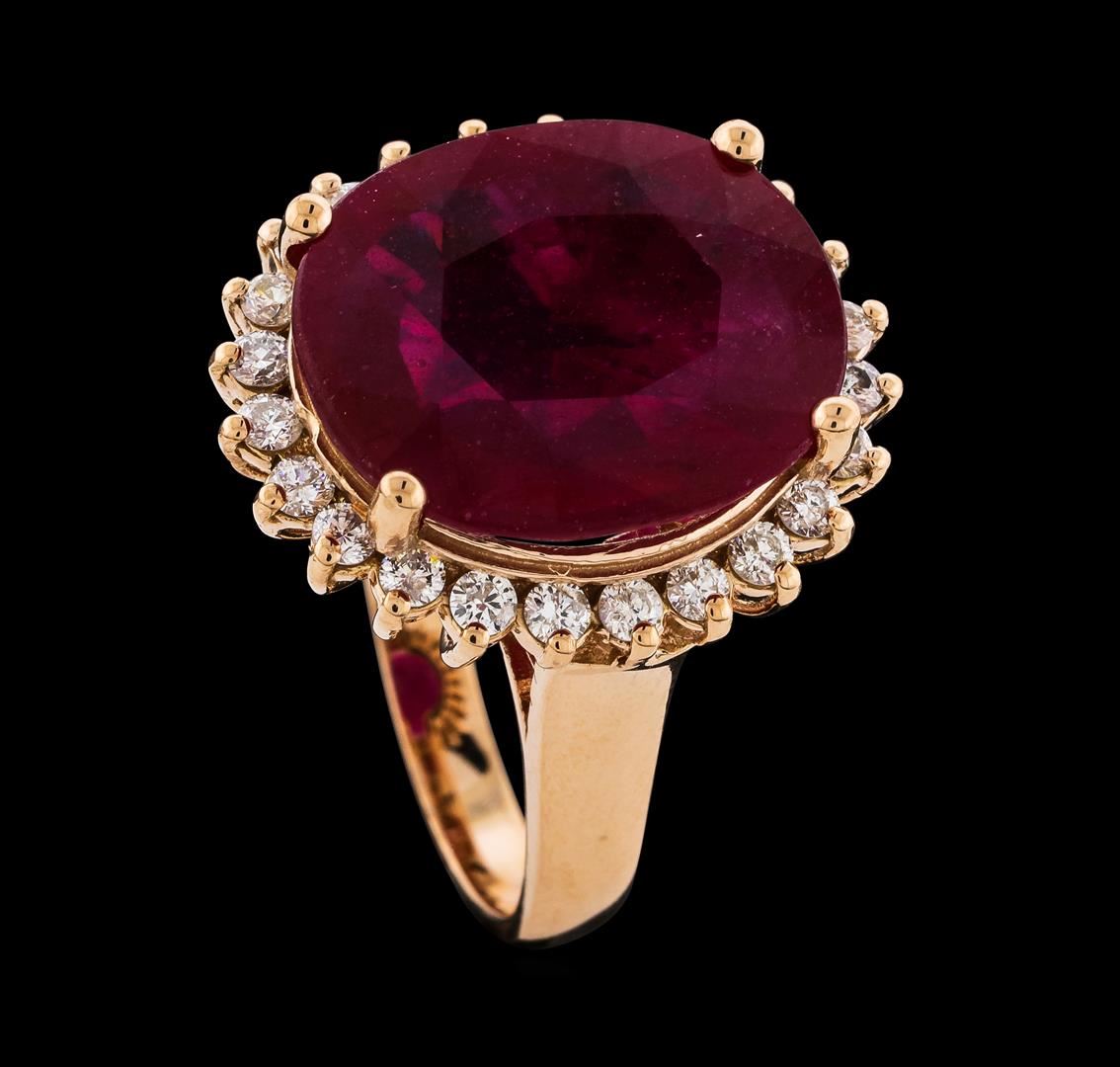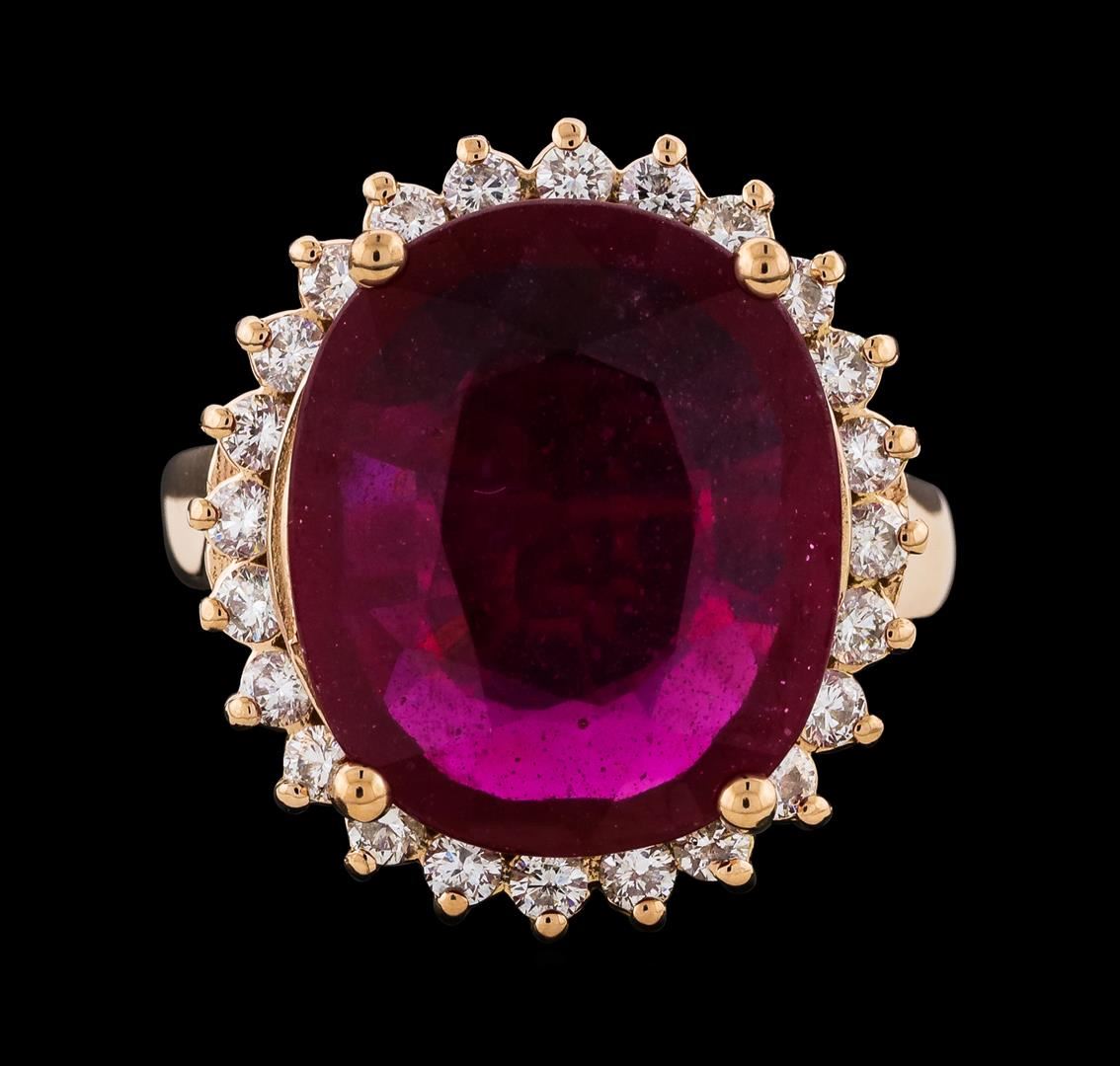 One electronically tested 14KT rose gold lady's cast fashion ring with a basket halo with a bright polish finish. The featured lady's ring has a shank measuring 2.70 millimeters wide. Identified with markings of '14K'. Condition is new, good workmanship. Containing: One prong set oval modified brilliant cut natural ruby, measuring 16.20 x 13.59 x 5.03mm, (depth est.) 10%. bulge factor, approximate weight of 11.51ct., clarity is heavily included, medium dark, very slightly brownish, slightly purplish red color, (GIA slpR 6/3), cut is good. Transmitting light somewhat diffusely, transparent to translucent. Naturally occurring internal & external characteristics are present. Indications of laboratory high temperature heat treatment, with glass & flux additives. Colored gemstones are presumed to have been subjected to commonly used enhancement processes. Graded in the setting. Twenty-Four prong set round brilliant cut diamonds, measuring 2.00 - 1.90 x 1.21mm (depth est.) approximate total weight of 24 Stones = 0.67ct. Graded in the setting. Clarity SI-1 to I-1. Color: H - I Cut Good. Total Weight of Colored Stones 11.51ct.. Total Weight of Diamonds 0.67ct.. Total Weight of Ring 8.90gm. GAS Appraised at $6,750.00.