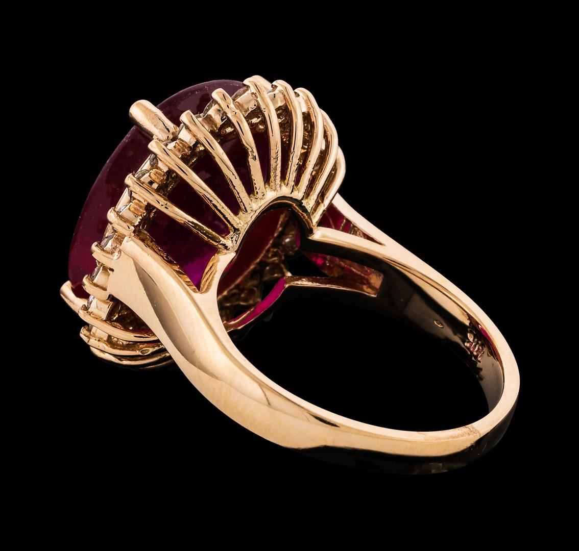 One electronically tested 14KT rose gold lady's cast fashion ring with a basket halo with a bright polish finish. The featured lady's ring has a shank measuring 2.70 millimeters wide. Identified with markings of '14K'. Condition is new, good workmanship. Containing: One prong set oval modified brilliant cut natural ruby, measuring 16.20 x 13.59 x 5.03mm, (depth est.) 10%. bulge factor, approximate weight of 11.51ct., clarity is heavily included, medium dark, very slightly brownish, slightly purplish red color, (GIA slpR 6/3), cut is good. Transmitting light somewhat diffusely, transparent to translucent. Naturally occurring internal & external characteristics are present. Indications of laboratory high temperature heat treatment, with glass & flux additives. Colored gemstones are presumed to have been subjected to commonly used enhancement processes. Graded in the setting. Twenty-Four prong set round brilliant cut diamonds, measuring 2.00 - 1.90 x 1.21mm (depth est.) approximate total weight of 24 Stones = 0.67ct. Graded in the setting. Clarity SI-1 to I-1. Color: H - I Cut Good. Total Weight of Colored Stones 11.51ct.. Total Weight of Diamonds 0.67ct.. Total Weight of Ring 8.90gm. GAS Appraised at $6,750.00.