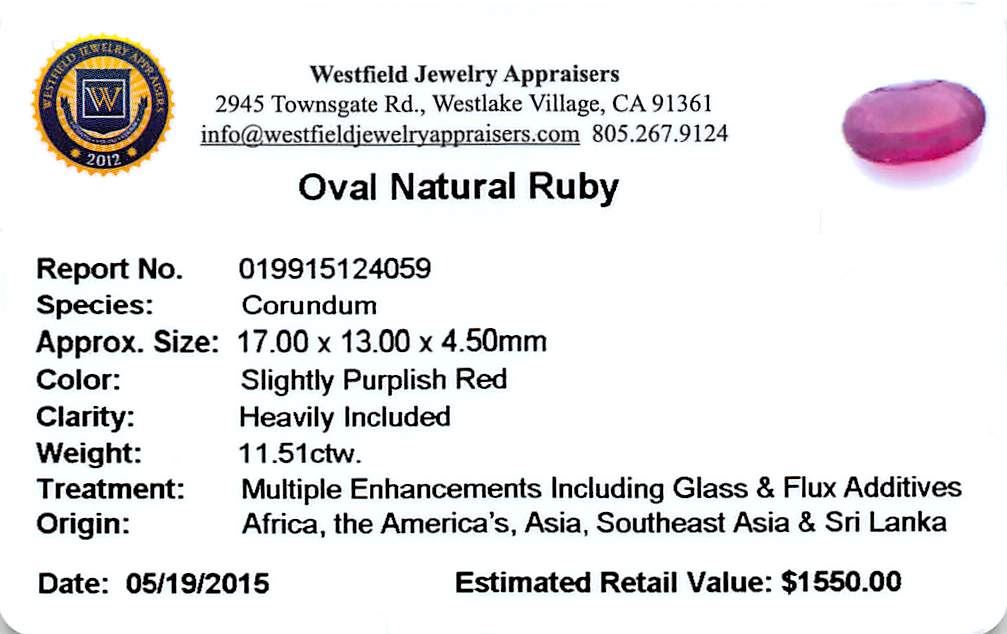 One oval mixed cut natural ruby, measuring 17.00 x 13.00 x 4.50mm, exact weight 11.51ct., clarity is heavily included, type II, medium dark, very slightly brownish, slightly purplish red color, (GIA slpR 6/3), cut is good. Transmitting light somewhat diffusely, transparent to translucent. Naturally occurring internal & external characteristics are present. Indications of laboratory high temperature heat treatment, with glass & flux additives. Ruby has a low tolerance to rhodium plating, repolishing the surface, & ultrasonic cleaning. Westfield Appraised at $1,550.00.