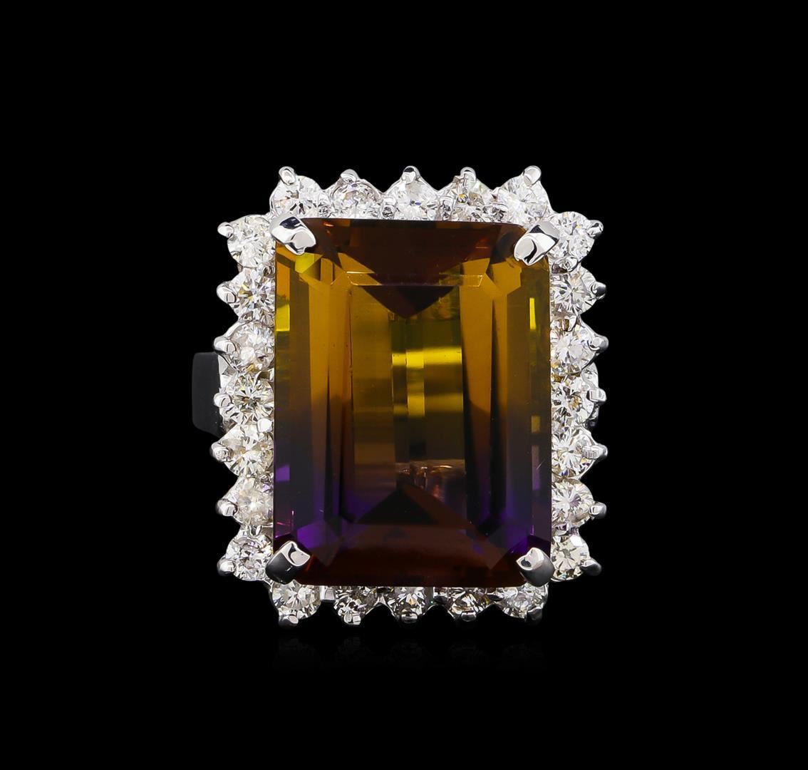 One electronically tested 14KT white gold lady's cast fashion ring with a basket halo with a bright polish finish. The featured lady's ring has a shank measuring 3.01 millimeters wide. Identified with markings of "585". Condition is new, good workmanship. Containing: One prong set emerald step cut natural ametrine quartz, measuring 16.03 x 12.16 x 8.09mm, approximate weight of 11.52ct., clarity is eye clean, type I, medium, moderately strong, purple color, (GIA P 5/4) to medium dark, moderately strong, yellowish orange, (GIA yO 6/4), cut is very good. Transmitting light with no distortion, transparent. Colored gemstones are presumed to have been subjected to commonly used enhancement processes. Graded in the setting. Twenty-Four prong set round brilliant cut diamonds, measuring 2.30 - 2.20 x 1.37mm (depth est.) approximate total weight of 24 Stones = 1.02ct. Graded in the setting. Clarity: SI-1 to SI-2. Color: G - I. Cut Good. Total Weight of Colored Stones 11.52ct. Total Weight of Diamonds 1.02ct. Total Weight of Ring 10.20gm. GAS Appraised.
