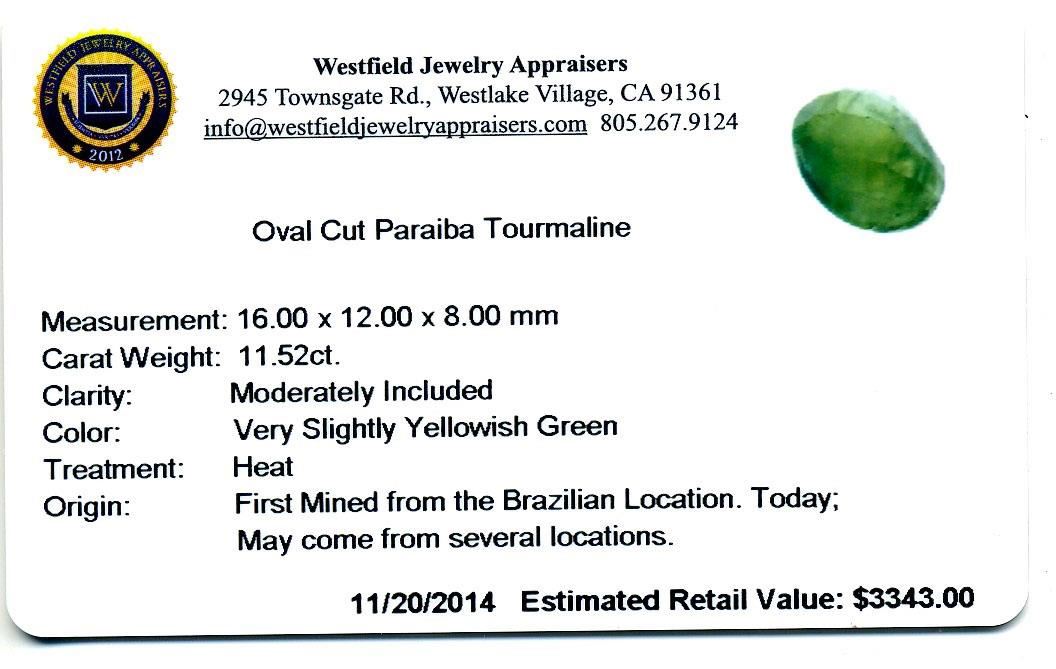 11.52ctw. Oval Cut Paraiba Tourmaline. Westfield Appraised at $3,343.00.