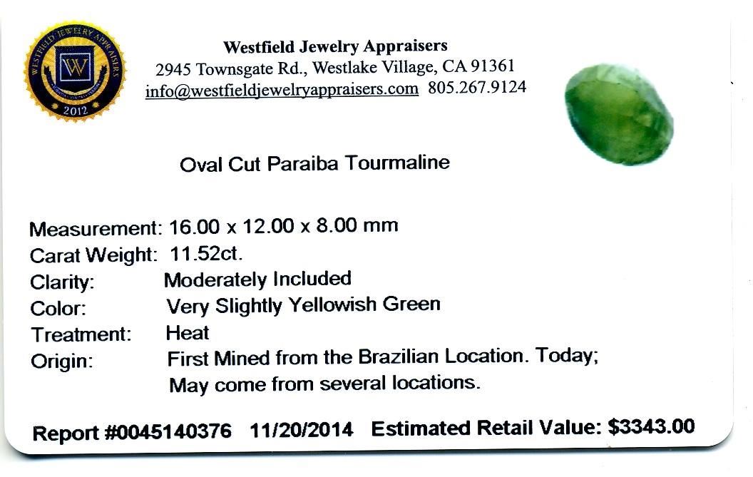 11.52ctw. Oval Cut Paraiba Tourmaline. Westfield Appraised at $3,343.00.