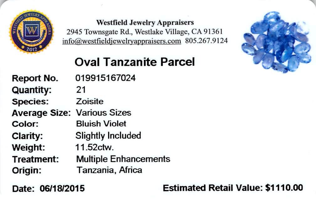 Twenty-one oval mixed cut natural tanzanites exact total weight 11.52ct., clarity is slightly included, type I, medium dark, very slightly grayish, bluish violet color, (GIA bV 6/3), cut is good. Transmitting light with a minimum of distortion, transpa Westfield Appraised at $1,110.00.