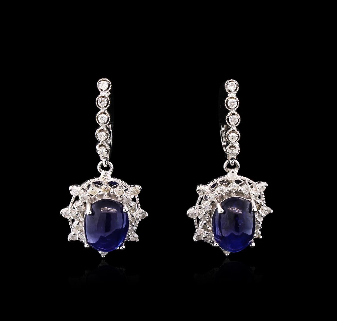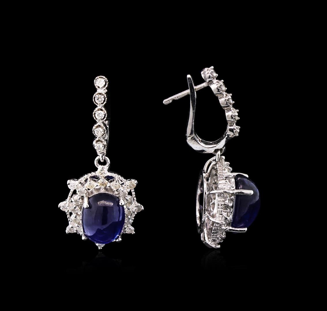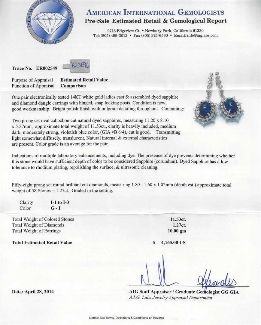 One pair electronically tested 14KT white gold ladies cast & assembled dyed sapphire and diamond dangle earrings with hinged, snap locking posts. Condition is new, good workmanship. Bright polish finish with milgrain detailing throughout. Containing: Two prong set oval cabochon cut natural dyed sapphires, measuring 11.20 x 8.10 x 5.27mm, approximate total weight of 11.53ct., clarity is heavily included, medium dark, moderately strong, violetish blue color, (GIA vB 6/4), cut is good. Transmitting light somewhat diffusely, Translucent, Natural internal & external characteristics are present. Color grade is an average for the pair. Indications of multiple laboratory enhancements, including dye. The presence of dye prevents determining whether this stone would have sufficient depth of color to be considered Sapphire (corundum). Dyed Sapphire has a low tolerance to rhodium plating, repolishing the surface, & ultrasonic cleaning. Fifty-eight prong set round diamonds, measuring 1.80 -1.60 x 1.02mm (depth est.) approximate total weight of 58 Stones = 1.27ct. Graded in the setting. Clarity: I-1 to I-3. Color: G - I. Total Weight of Colored Stones: 11.53ct. Total Weight of Diamonds: 1.27ct. Total Weight of Earrings: 10.00gm. AIG Appraised at $4,165.00.