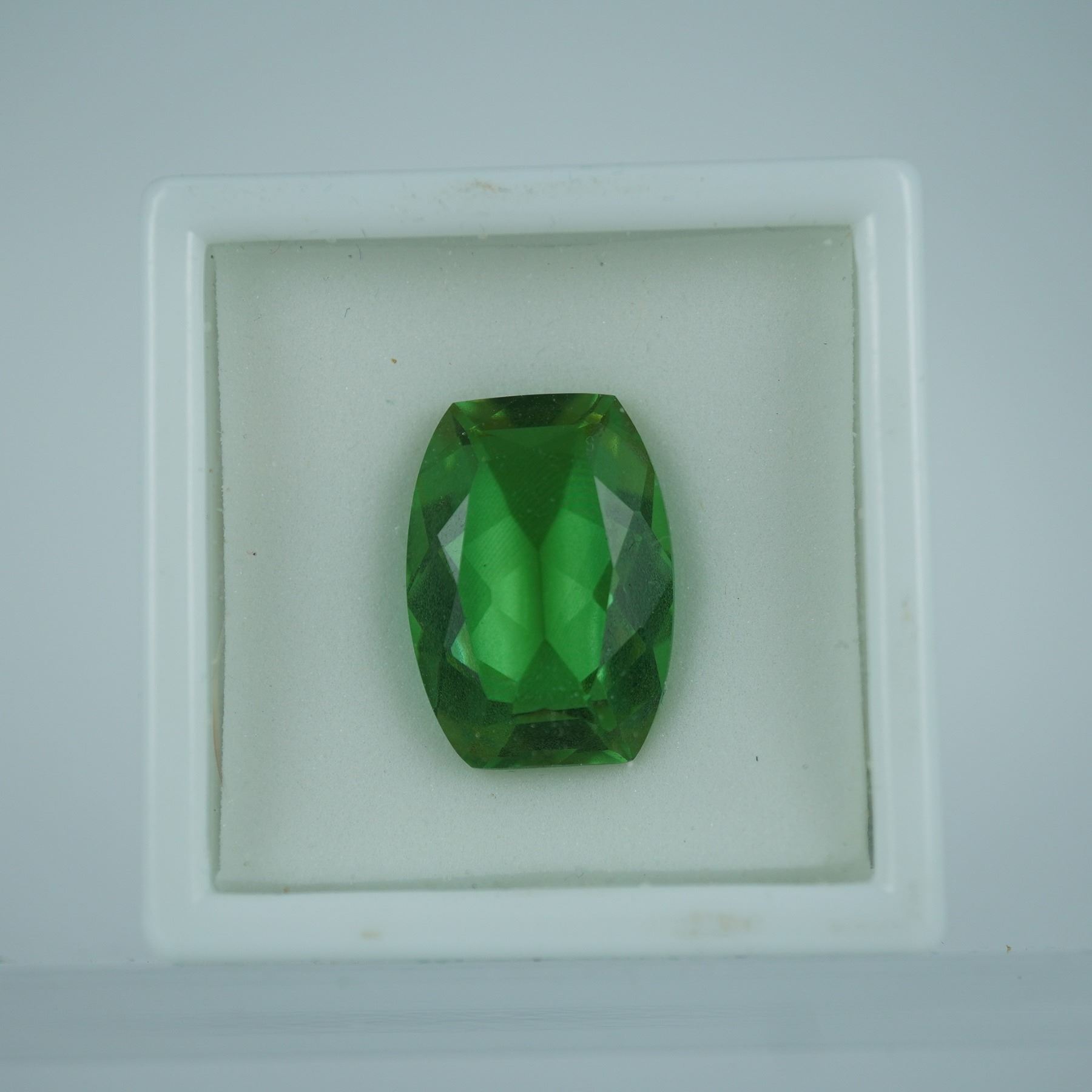 This impressive simulated zandrite gemstone weighs approximately 11.55 carats and features a vivid green hue with brilliant internal fire. The fancy cut maximizes sparkle and light reflection, enhancing the gem's bold presence. Zandrite simulants are known for their color-shifting properties under different lighting, making them a unique and affordable alternative to natural color-change stones. This piece is presented in a protective display case for elegant safekeeping.