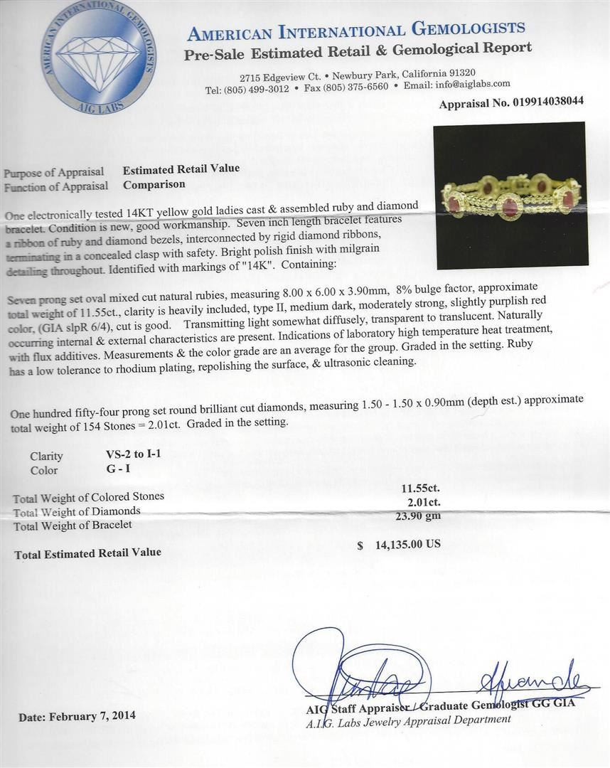 One electronically tested 14KT yellow gold ladies cast & assembled ruby and diamond bracelet. Condition is new, good workmanship. Seven inch length bracelet features a ribbon of ruby and diamond bezels, interconnected by rigid diamond ribbons, terminating in a concealed clasp with safety. Bright polish finish with milgrain detailing throughout. Identified with markings of "14K". Containing: Seven prong oval mixed cut natural rubies, measuring 8.00 x 6.00 x 3.90mm, 8% bulge factor, approximate total weight of 11.55ct., clarity is heavily included, type II, medium dark, moderately strong, slightly purplish red color, (GIA slpR 6/4), cut is good. Transmitting light somewhat diffusely, transparent to translucent. Naturally occurring internal & external characteristics are present. Indications of laboratory high temperature heat treatment, with flux additives. Measurements & the color grade are an average for the group. Graded in the setting. Ruby has a low tolerance to rhodium plating replenishing the surface, & ultrasonic cleaning. The bracelet also contains One hundred fifty-four prong set round brilliant cut diamonds, measuring 1.50 - 1.50 x 0.90mm (depth est.) approximate total weight of 154 Stones = 2.01ct. Graded in the setting. Clarity: VS-2 to I-1. Color: G-I. Total Weight of Colored Stones 11.55ct. Total Weight of Diamonds 2.01ct. Total Weight of Bracelet 23.90gm. AIG Appraised at $14,135.00.