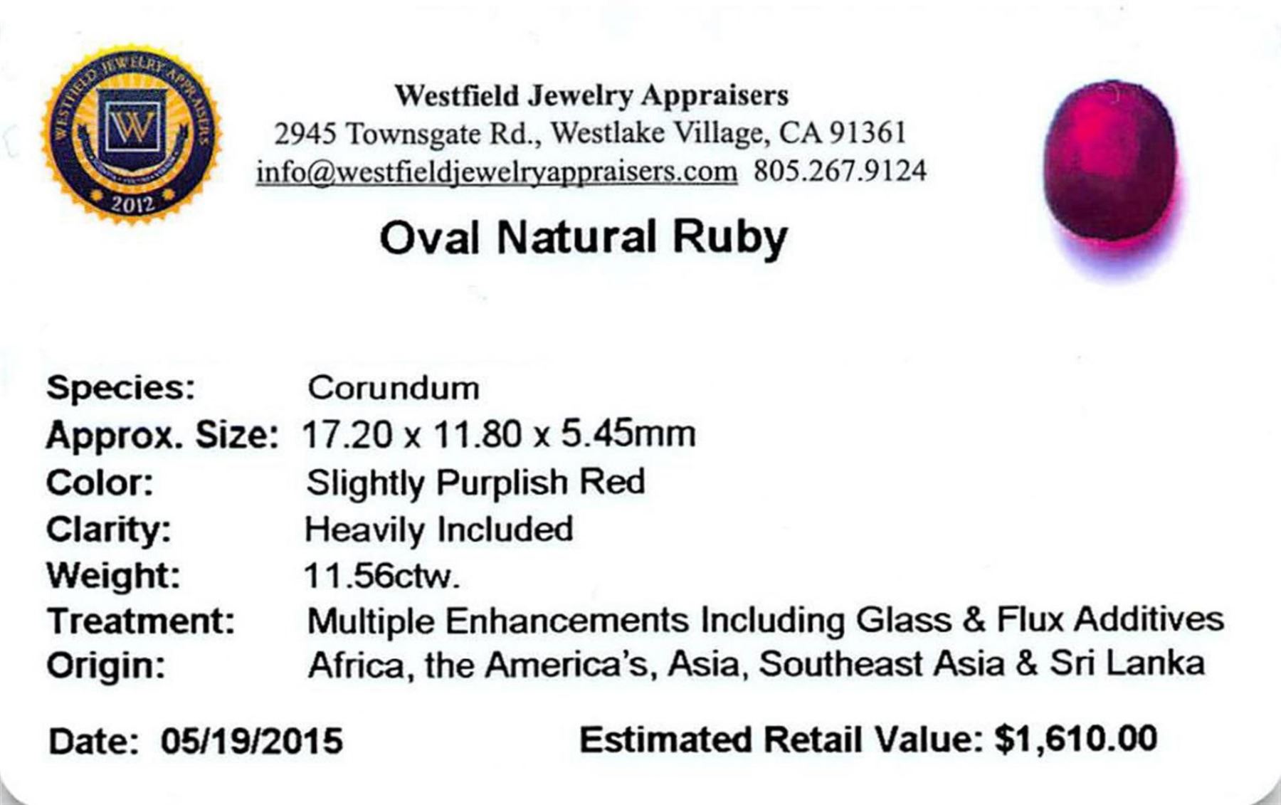 One oval mixed cut natural ruby, measuring 17.20 x 11.80 x 5.45mm, exact weight 11.56ct., clarity is heavily included, type II, dark, very slightly brownish, slightly purplish red color, (GIA slpR 7/3), cut is good. Transmitting light somewhat diffusely, translucent. Naturally occurring internal & external characteristics are present. Indications of laboratory high temperature heat treatment, with glass & flux additives. Westfield Appraised.