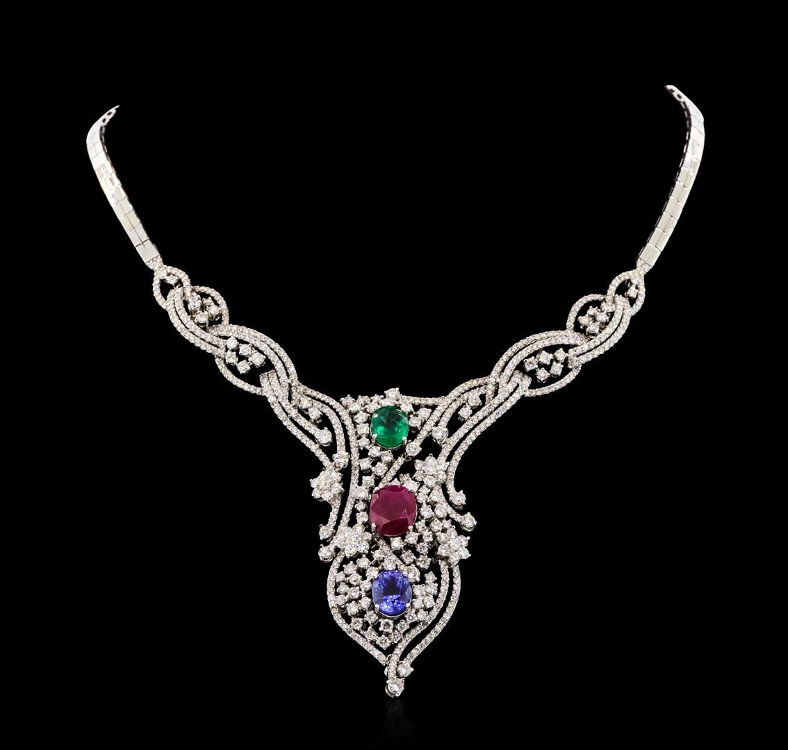 One electronically tested 14KT white gold necklace weighing 44.74 grams including round cut diamonds weighing 12.39ctw, one center oval shape natural ruby weighing 5.01ctw, one center oval shape Ceylon natural sapphire weighing 4.15ctw and one center oval shape fine natural emerald weighing 2.40ctw. All VS-SI, G-H color. All center stones fine cutting, fine quality. RBGS Appraised at $200,000.00.