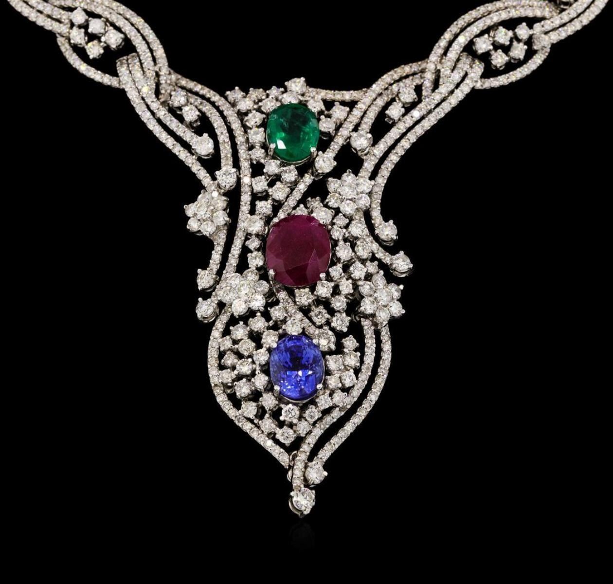 One electronically tested 14KT white gold necklace weighing 44.74 grams including round cut diamonds weighing 12.39ctw, one center oval shape natural ruby weighing 5.01ctw, one center oval shape Ceylon natural sapphire weighing 4.15ctw and one center oval shape fine natural emerald weighing 2.40ctw. All VS-SI, G-H color. All center stones fine cutting, fine quality. RBGS Appraised.