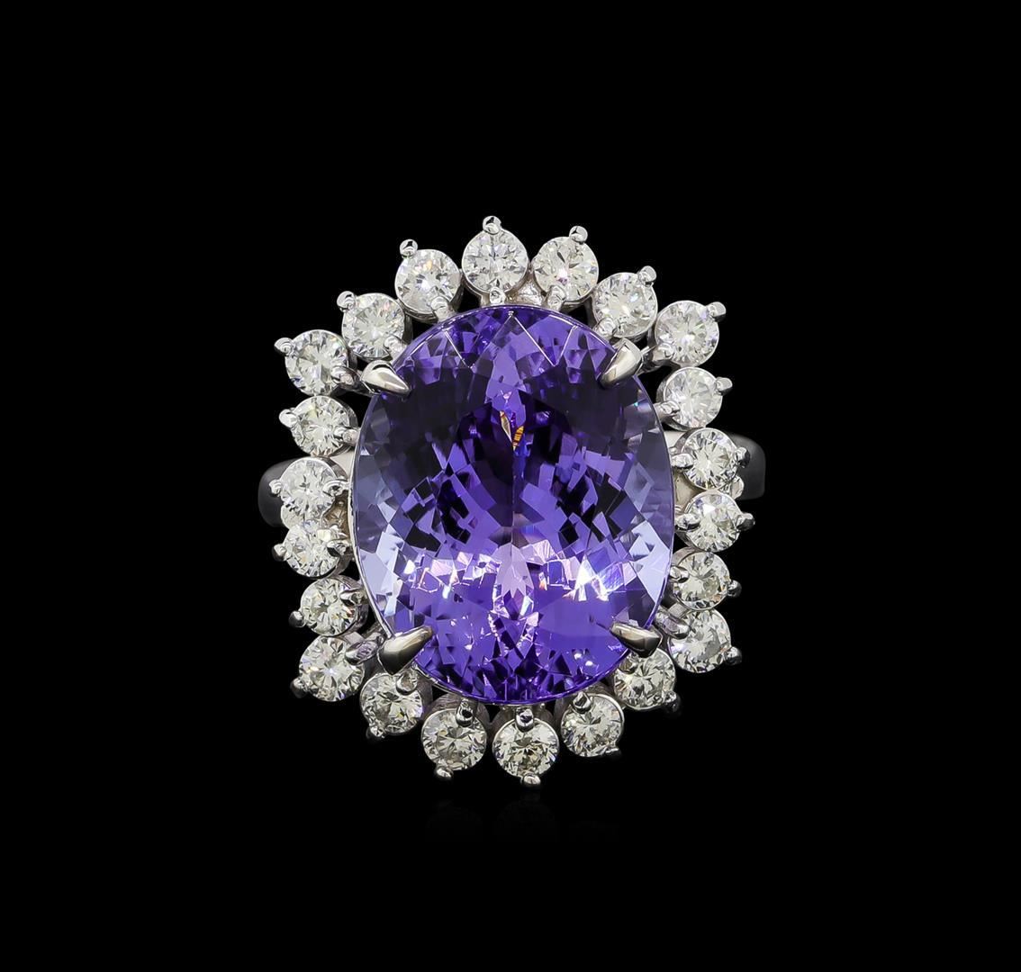 One electronically tested 14KT white gold lady's cast fashion ring with a staggered basket halo with a bright polish finish. The featured lady's ring has a shank measuring 2.65 millimeters wide. Identified with markings of 'K14'. Condition is new, good workmanship. Containing: One prong set oval modified brilliant cut natural tanzanite, measuring 15.32 x 12.33 x 8.65mm, (depth est.) approximate weight of 11.57ct., clarity is eye clean, medium light, moderately strong, bluish violet color, (GIA bV 4/4), cut is very good. Transmitting light with no distortion, transparent. Colored gemstones are presumed to have been subjected to commonly used enhancement processes. Graded in the setting. Fourteen prong set round brilliant cut diamonds, measuring 2.50 - 2.40 x 1.52mm (depth est.) approximate total weight of 14 Stones = 0.77ct. Graded in the setting. Clarity SI-1 to I-1. Color: G - H Cut Good Eight prong set round brilliant cut diamonds, measuring 2.30 - 2.20 x 1.35mm (depth est.) approximate total weight of 8 Stones = 0.33ct. Graded in the setting. Clarity SI-1 to I-1. Color: G - H Cut Good. Total Weight of Colored Stones 11.57ct.. Total Weight of Diamonds 1.10ct.. Total Weight of Ring 8.20gm GAS Appraised.