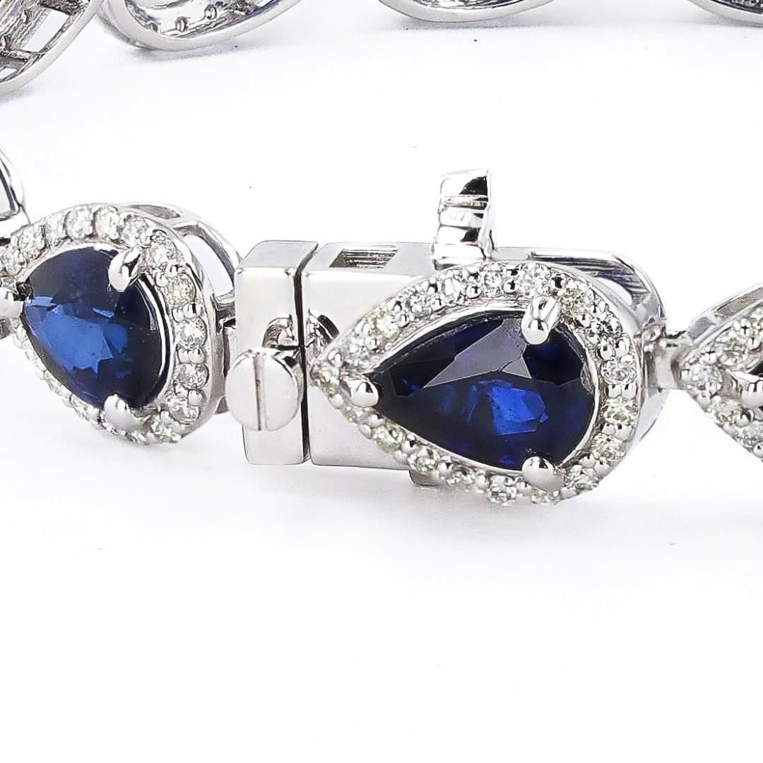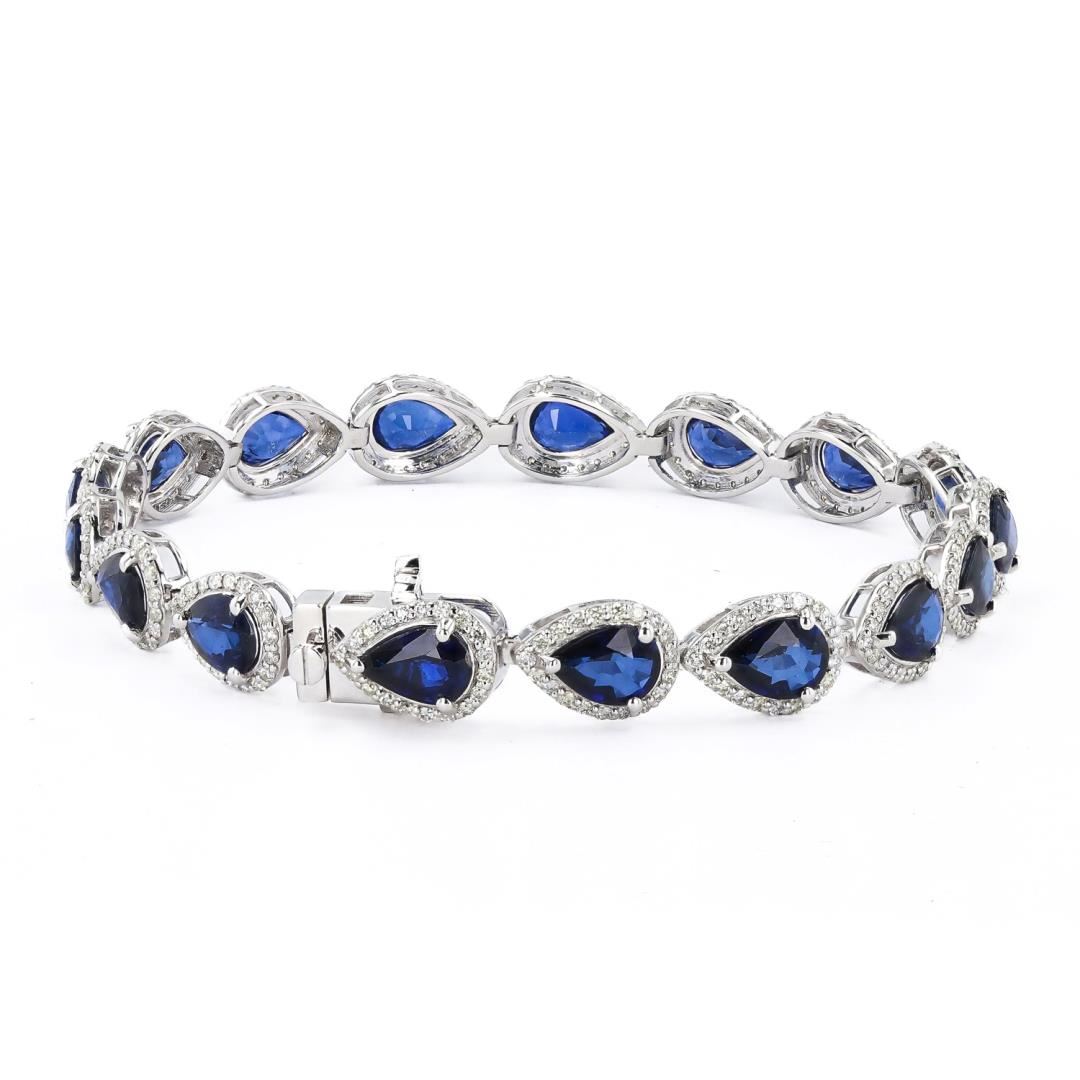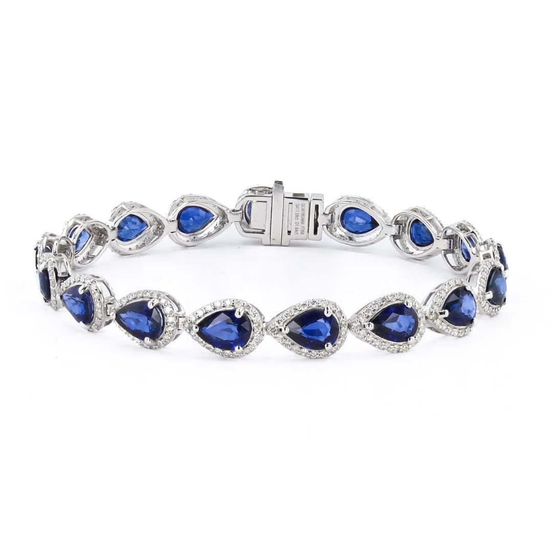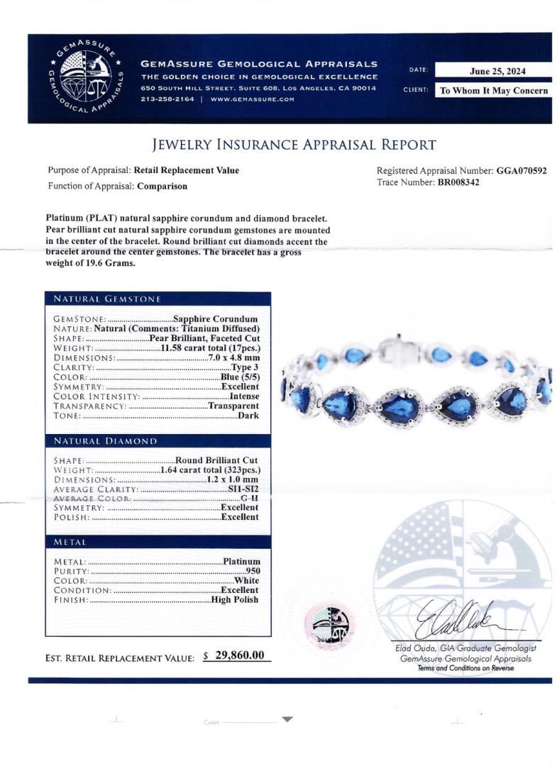 Platinum (PLAT) natural sapphire corundum and diamond bracelet. Pear brilliant cut natural sapphire corundum gemstones are mounted in the center of the bracelet. Round brilliant cut diamonds accent the bracelet around the center gemstones. The bracelet has a gross weight of 19.6 Grams. Brand: Oscar Friedman #NATURAL GEMSTONE# GEMSTONE: Sapphire Corundum; NATURE: Natural (Comments: Titanium Diffused); SHAPE: Pear Brilliant, Faceted Cut; WEIGHT: 11.58 carat total (17pcs.); DIMENSIONS: 7.0 x 4.8mm; CLARITY: Type 3; COLOR: Blue (5/5); SYMMETRY: Excellent; COLOR INTENSITY: Intense; TRANSPARENCY: Transparent; TONE: Dark #NATURAL DIAMOND# SHAPE: Round Brilliant Cut; WEIGHT: 1.64 carat total (323pcs.); DIMENSIONS: 1.2 x 1.0mm; AVERAGE CLARITY: SI1-SI2; AVERAGE COLOR: G-H; SYMMETRY: Excellent; POLISH: Excellent #METAL# METAL: Platinum; PURITY: 950; COLOR: White; CONDITION: Excellent; FINISH: High Polish #Size: 7