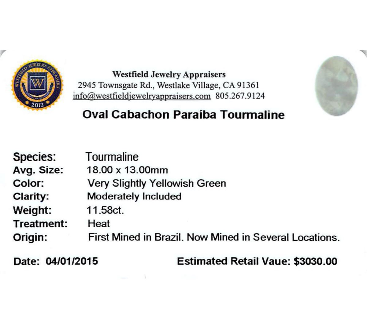 One oval cabochon cut natural Paraiba tourmaline exact weight 11.58ct., clarity is moderately included, cut is good. Westfield Appraised at $3,030.00.