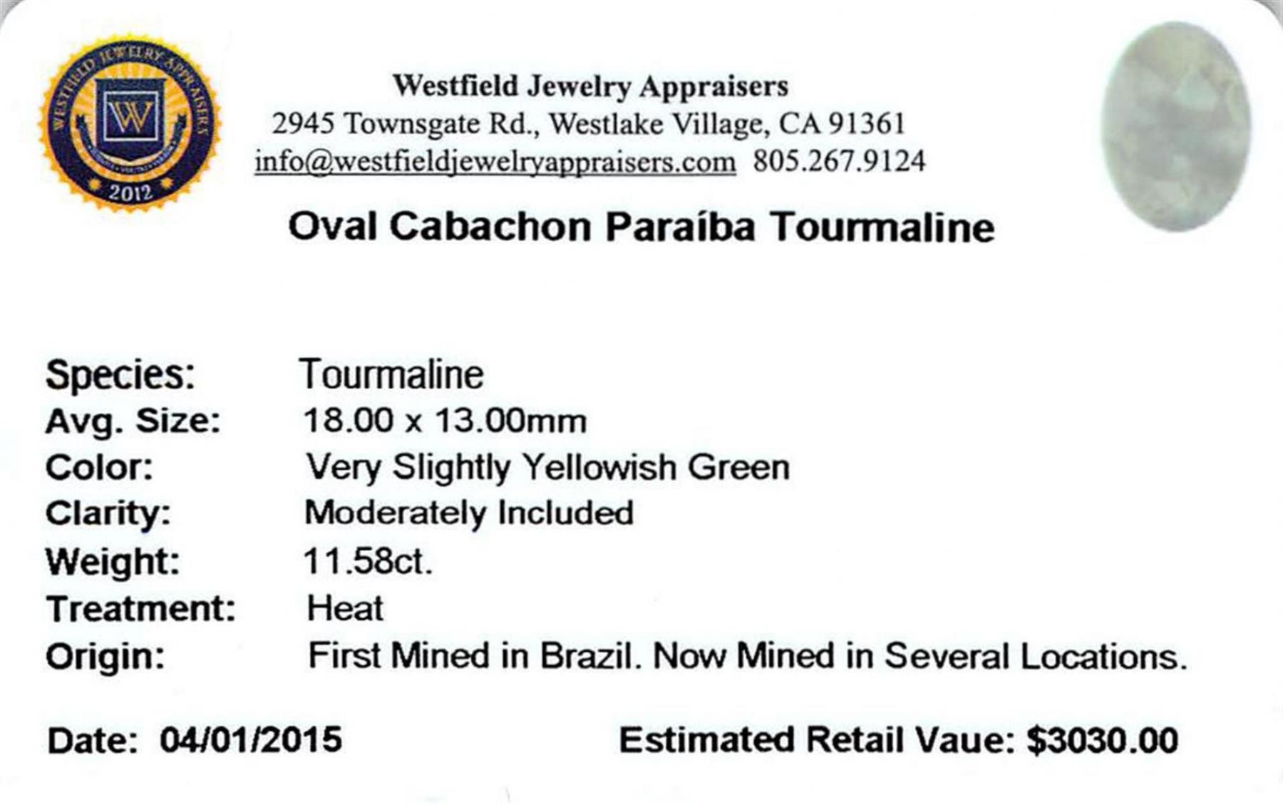 One oval cabochon cut natural Paraiba tourmaline exact weight 11.58ct., clarity is moderately included, cut is good. Westfield Appraised.
