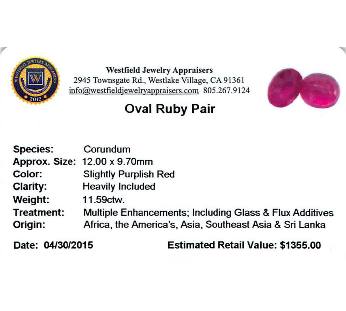 Two oval mixed cut natural rubies, measuring 12.00 x 9.70 x 5.70mm, exact total weight 11.59ct., clarity is heavily included, type II, dark, very slightly brownish, slightly purplish red color, (GIA slpR 7/3), cut is good. Transmitting light somewhat diffusely, translucent. Naturally occurring internal & external characteristics are present. Indications of laboratory high temperature heat treatment, with glass & flux additives. Ruby has a low tolerance to rhodium plating, repolishing the surface, & ultrasonic cleaning. Westfield Appraised at $1,355.00.