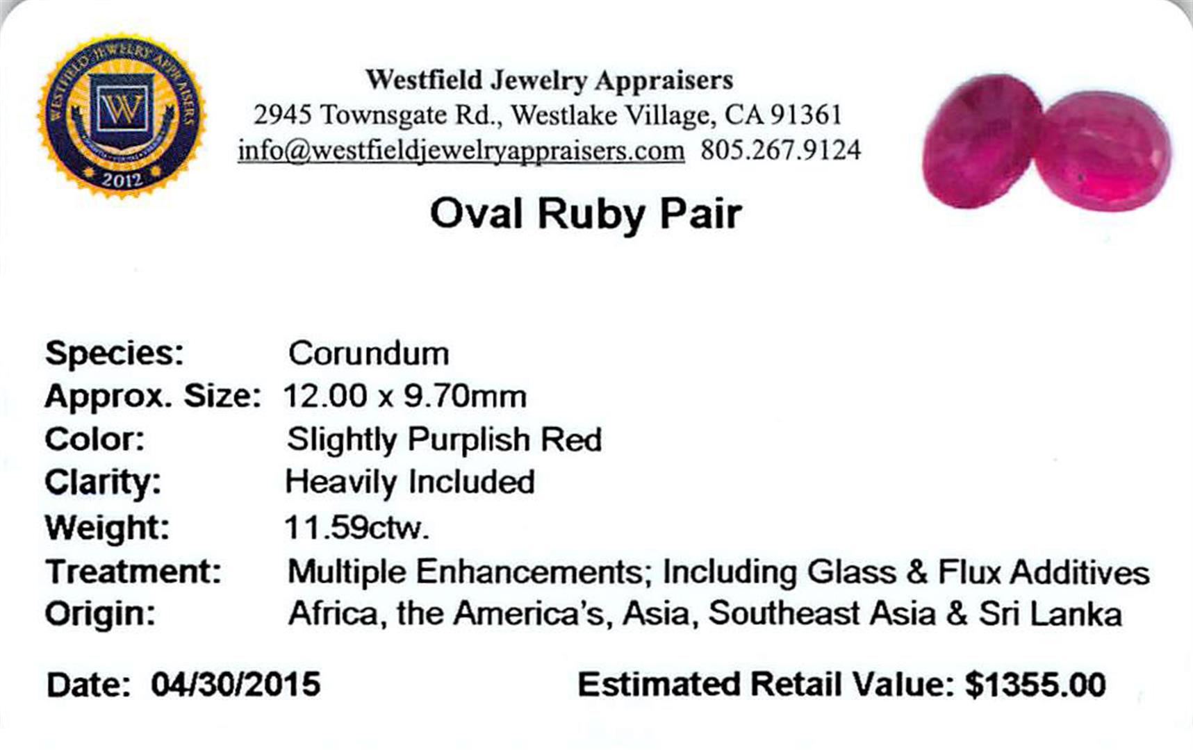 Two oval mixed cut natural rubies, measuring 12.00 x 9.70 x 5.70mm, exact total weight 11.59ct., clarity is heavily included, type II, dark, very slightly brownish, slightly purplish red color, (GIA slpR 7/3), cut is good. Transmitting light somewhat diffusely, translucent. Naturally occurring internal & external characteristics are present. Indications of laboratory high temperature heat treatment, with glass & flux additives. Ruby has a low tolerance to rhodium plating, repolishing the surface, & ultrasonic cleaning. Westfield Appraised at $1,355.00.