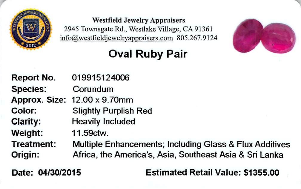 Two oval mixed cut natural rubies, measuring 12.00 x 9.70 x 5.70mm, exact total weight 11.59ct., clarity is heavily included, type II, dark, very slightly brownish, slightly purplish red color, (GIA slpR 7/3), cut is good. Transmitting light somewhat diffusely, translucent. Naturally occurring internal & external characteristics are present. Indications of laboratory high temperature heat treatment, with glass & flux additives. Ruby has a low tolerance to rhodium plating, repolishing the surface, & ultrasonic cleaning. Westfield Appraised at $1,355.00.