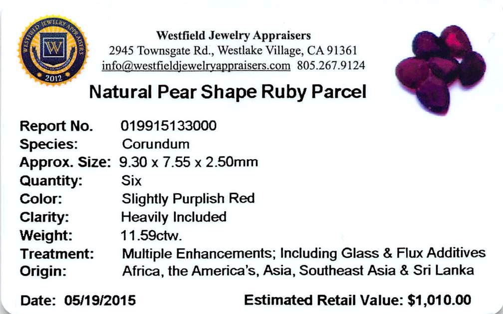Six pear mixed cut natural rubies, measuring 9.30 x 7.55 x 2.50mm, exact total weight 11.59ct., clarity is heavily included, type II, dark, very slightly brownish, slightly purplish red color, (GIA slpR 7/3), cut is good. Measurements are an average for the group. Transmitting light somewhat diffusely, translucent. Naturally occurring internal & external characteristics are present. Indications of laboratory high temperature heat treatment, with glass & flux additives. Westfield Appraised at $1,010.00.