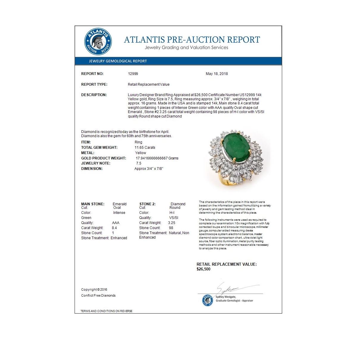 REF-370H4A -12999 ---- 11.65 CTW Emerald & Diamond Ring 14K Yellow Gold ---- Luxury Designer Brand Ring Appraised at $26,500 Certificate Number US12999 14k Yellow gold, Ring Size is 7.5, Ring measuring approx. 3/4" x 7/8" , weighing in total approx. 16 grams. Made in the USA and is stamped 14k, Main stone 8.4 carat total weight containing 1 pieces of Intense Green color with AAA quality Oval shape cut Emerald , Stone #2 3.25 carat total weight containing 98 pieces of H-I color with VS/SI quality Round shape cut Diamond