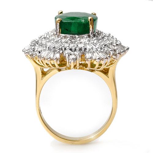 11.65 CTW Emerald & Diamond Ring 14K Yellow Gold ---- Luxury Designer Brand Ring Appraised Retail Price at $26,500 ---- SKU Number US12999 14k Yellow gold Ring Size is 7.5, Ring measuring approx. 3/4" x 7/8" , weighing in total approx. 16 grams. Made in the USA and is stamped 14k, Main stone 8.4 carat total weight containing 1 pieces of Intense Green color with AAA quality Oval shape cut Emerald , Stone #2 3.25 carat total weight containing 98 pieces of H-I color with VS/SI quality Round shape cut