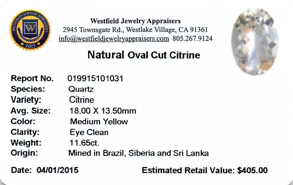 One oval cut natural citrine quartz exact weight 11.65ct., clarity is eye clean, type I, medium, slightly brownish, yellowish orange color, (GIA yO 5/2), cut is good. Westfield Appraised at $405.00.