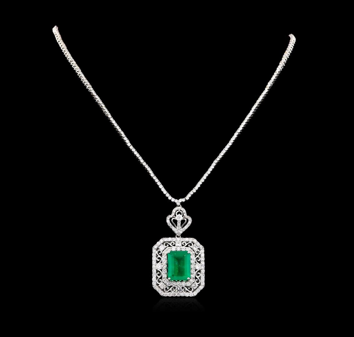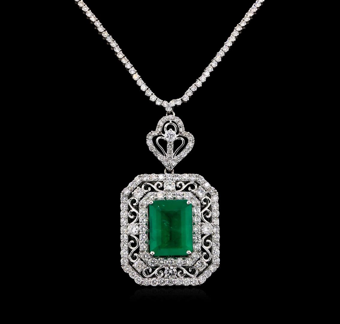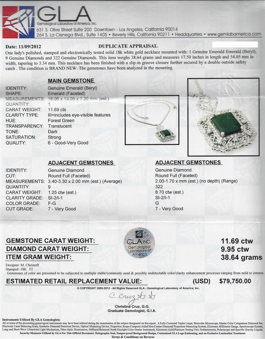 One lady's polished, stamped and electronically tested solid 18k white gold necklace mounted with: 1 Genuine Emerald (Beryl), 9 Genuine Diamonds and 322 Genuine Diamonds. This item weighs 38.64 grams and measures 17.50 inches in length and 54.05 mm in width, tapering to 3.34 mm. This necklace has been finished with a slip-in groove closure further secured by a double outside safety catch. The condition is Brand New. The gemstones have been analyzed in the mounting. Main Gemstone: Identity: Genuine Emerald (Beryl). Shape: emerald (faceted). Measurements: 18.06 x 13.05 x 7.30 mm (est.) Quantity: 1. Carat Weight: 11.69 cts. Clarity Type: III=includes eye-visible features. Hue: forest green. Transparency: translucent. Tone: dark. Saturation: strong. Quality: 6 - good-very good. Adjacent Gemstones: Identity: genuine diamond. Cut: round full (faceted). Measurements: 3.40-3.30 x 2.00 mm (est.) (average). Quantity: 9. Cart Weight: 1.25 ctw (est.). Clarity Grade: F-G. Cut Grade: 7 - Very Good. Adjacent Gemstones: Identity: genuine diamond. Cut: round full (faceted). Measurements: 2.00-1.70 x mm (est.) (no depth) (range). Quantity: 322. Cart Weight: 8.70 ctw (est.). Clarity Grade: SI2/I-1. Color Grade: G. Cut Grade: 7 - Very Good. GLA Appraised at $79,750.00.