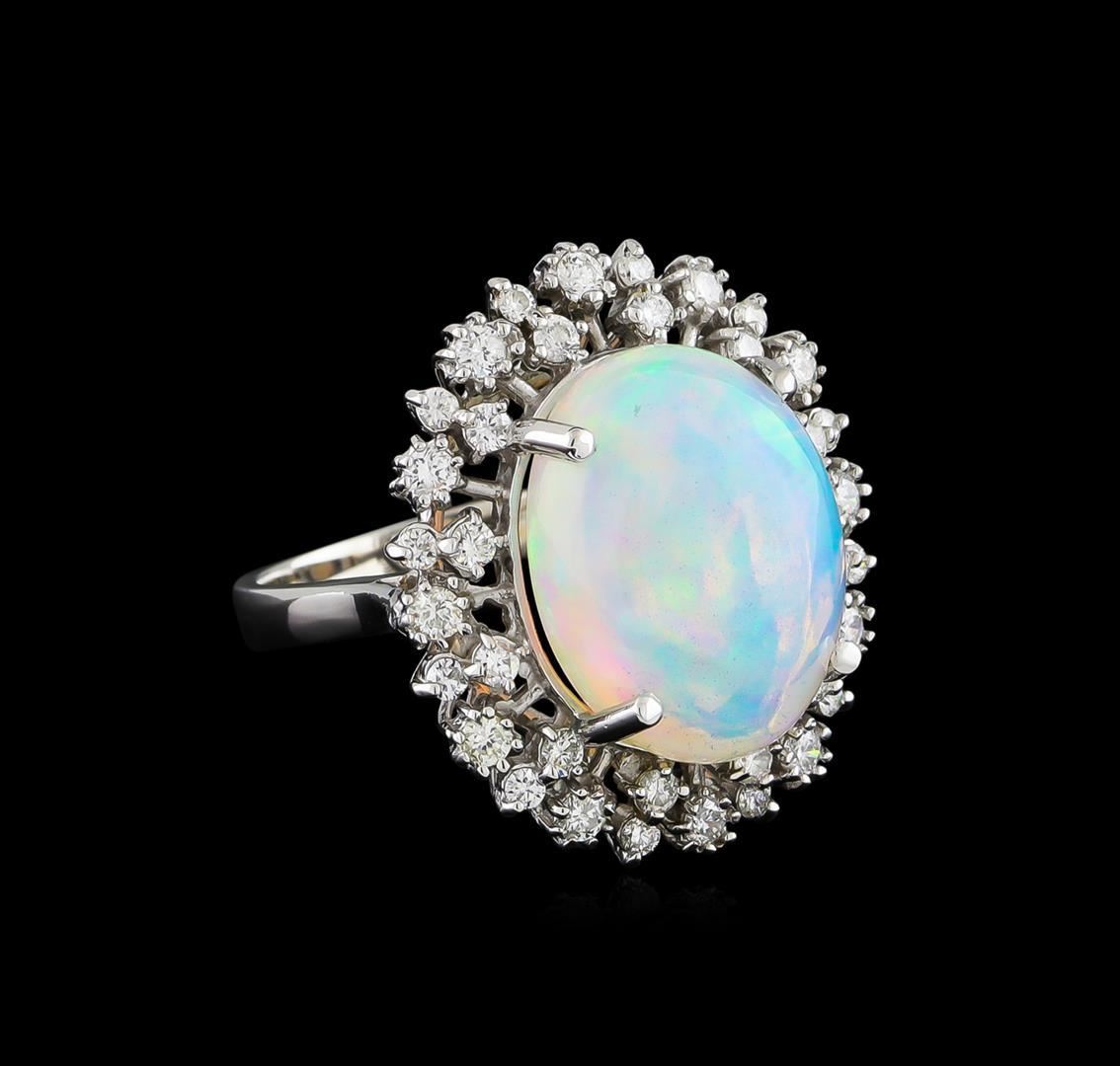 One electronically tested 14KT white gold ladies cast opal and diamond ring with a bright polish finish. The featured opal is set within stylized diamond set floret bezels, completed by a two and one-half millimeter wide band. Identified with markings of "14K". Condition is new, good workmanship. Containing: One semi crystal opal that is cut in a oval shaped cabochon and is prong set, measuring 16.50 mm long x 13.25 mm wide, and 8.50 mm thick and the approximate weight is 11.69 carats. The opal has a bright, multicolor play of color (fire) in a flashfire pattern; a high dome; a good cut; slightly included; consistent in its brightness and pattern; and is slightly directional. Graded in the setting. Twelve prong set round brilliant cut diamonds, measuring 2.00 - 2.00 x 1.20mm (depth est.) approximate. Total Weight of 12 Stones = 0.44ct. Graded in the setting. Clarity: SI-2 to I-2. Color: F - H Twenty-Four prong set round brilliant cut diamonds, measuring 1.60 - 1.60 x 0.96mm (depth est.) approximate. Total Weight of 24 Stones = 0.45ct. Graded in the setting. Clarity: SI-2 to I-2. Color: F - H. Total Weight of Diamonds 0.89ct. Total Weight of Opals 11.69ct. Total Weight of Ring 8.73gm. AIG Appraised.