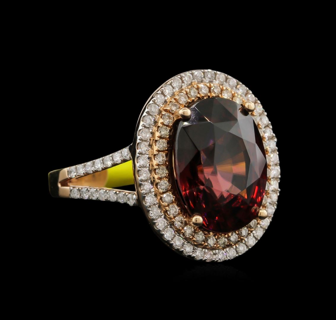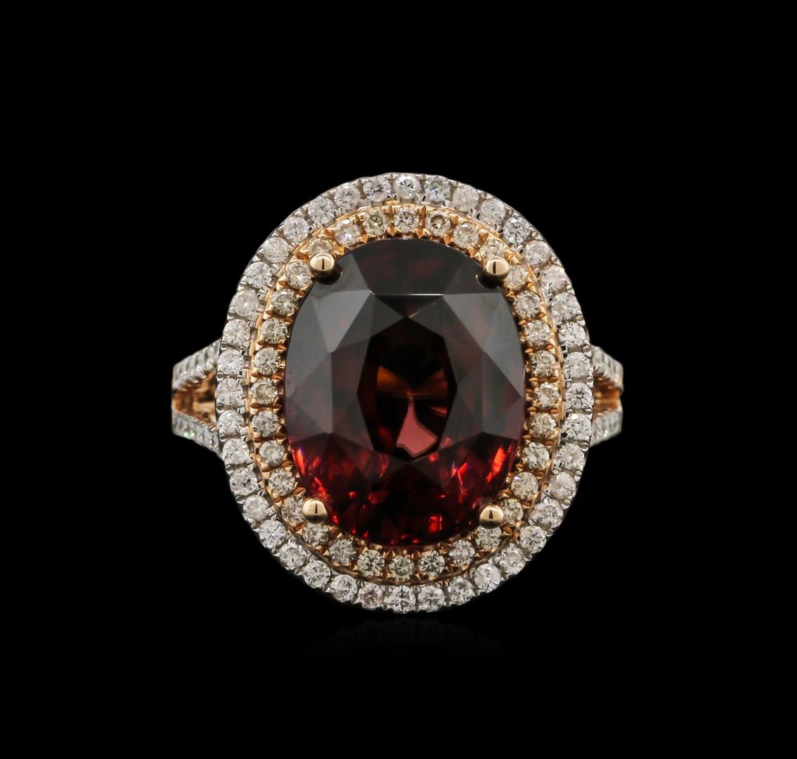One electronically tested 14KT rose gold lady's combination cast & assembled fashion ring with a split shank with a bright polish finish. The featured lady's ring has a double halo motif and a 2.7 millimeter wide shank. Identified with markings of "14K". Condition is new, good workmanship. Containing: One prong set oval standard brilliant cut natural red zircon, measuring 13.90 x 10.90 x 7.55mm, approximate weight of 11.69ct., clarity is eye clean, type II, medium dark, slightly brownish, red orange color, (GIA RO 6/2), cut is good. Colored gemstones are presumed to have been subjected to commonly used enhancement processes, Graded in the setting. Eighty-Six split prong set round brilliant cut diamonds, measuring 1.40 - 1.30 x 0.88mm (depth est.) approximate. Total Weight of 86 Stones = 0.86ct. Graded in the setting. Clarity: SI-2 to I-1. Color: H - Good. Total Weight of Colored Stones 11.69ct. Total Weight of Diamonds 0.86ct. Total Weight of Ring 8.60gm. GAS Appraised at $12,655.00.