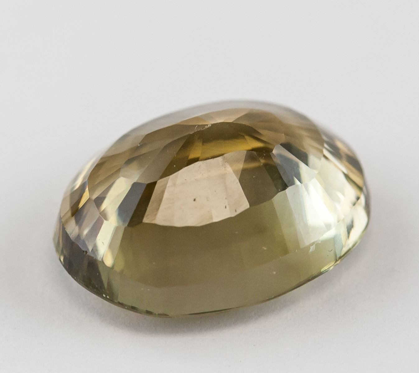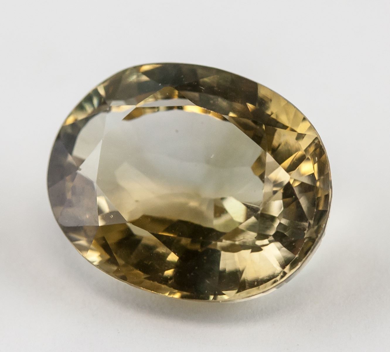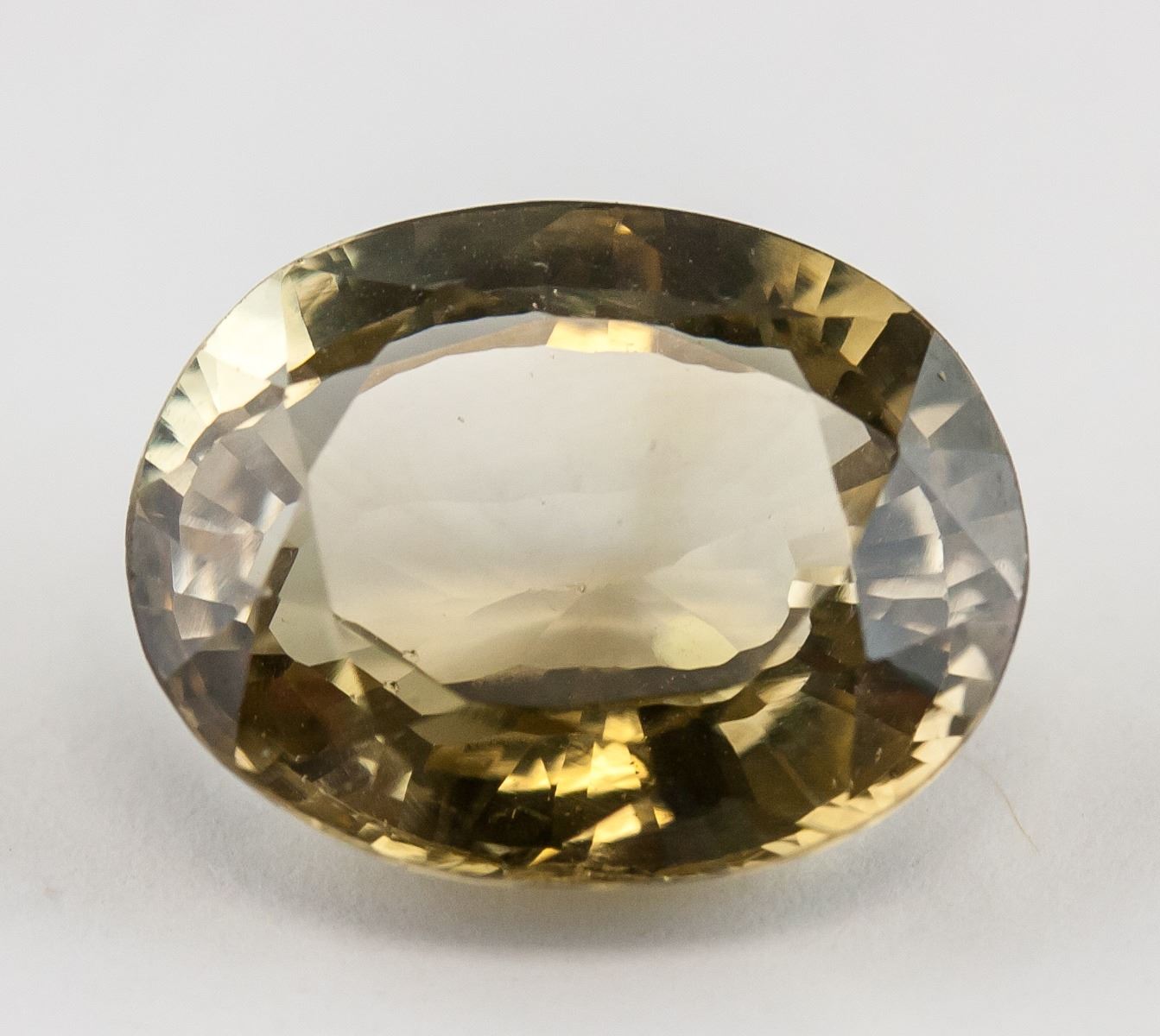 One (1) 11.70 ct oval cut yellow sapphire gemstone. 14.87 x 11.66 x 6.91 mm. Density: 3.95
