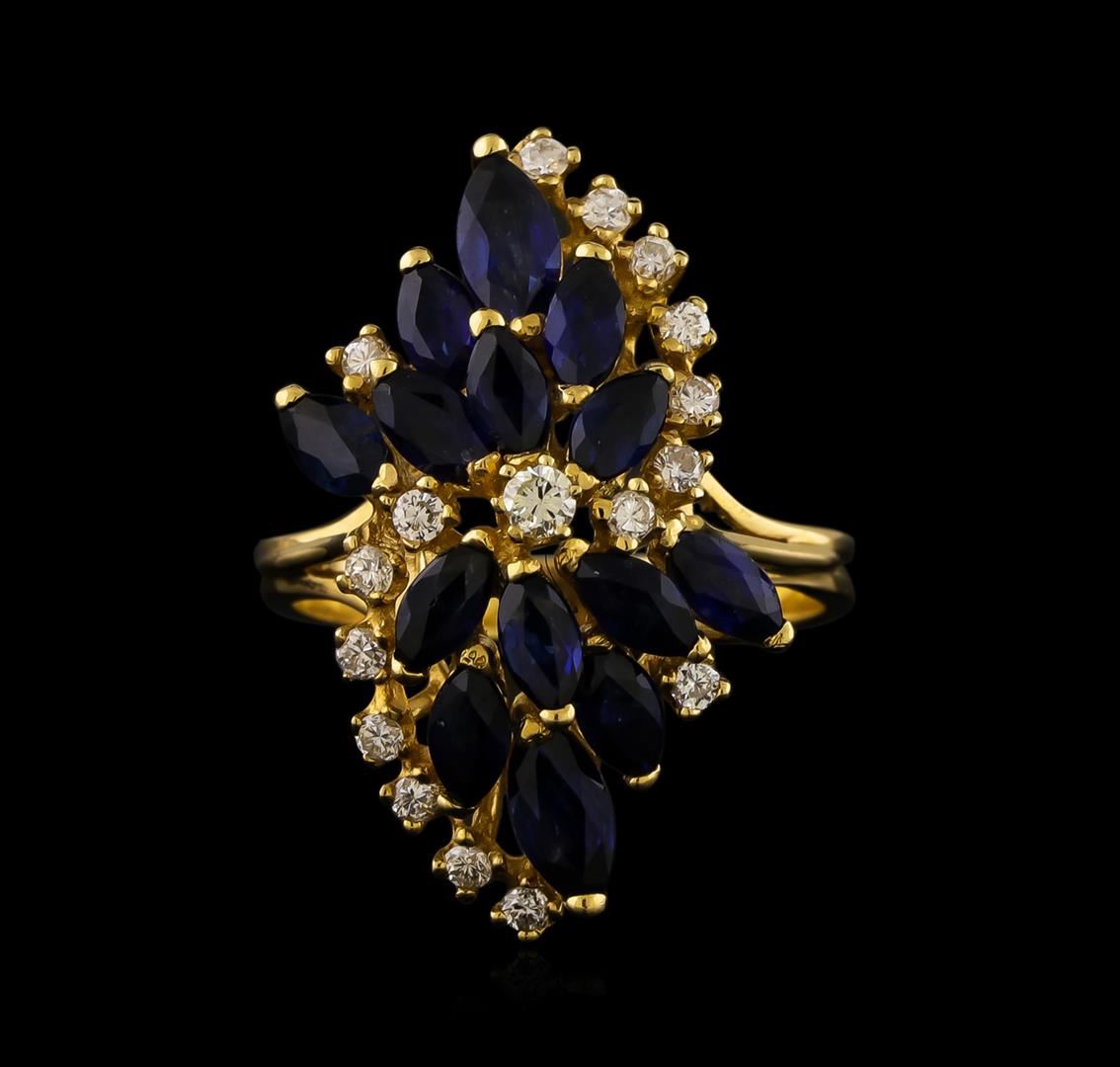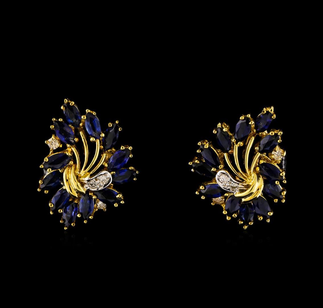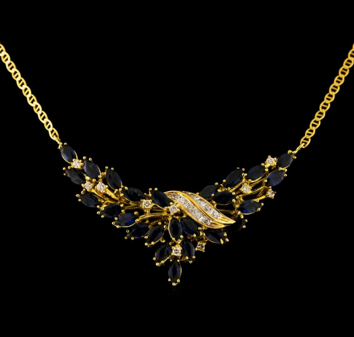 electronically tested 14KT yellow gold ladies cast & assembled sapphire and diamond cluster ensemble. The ensemble includes a sapphire and diamond necklace, cluster ring and a matching pair of earrings. The necklace features a two and one-quarter inch long garland of sapphires with diamond ribbon accents and dispersed diamonds transitioning into a fourteen inch length designer style chain, terminating in a lobster claw clasp. The ring features a tiered sapphire cluster with diamond accents, supported by a two millimeter wide grooved band. The ensemble is completed by a pair of earrings, each featuring a bouquet of sapphires with diamond accents. Bright polish finish with rhodium accents. Identified with markings of "14K". Condition is good. Containing: Twenty-seven prong set marquise mixed cut natural blue sapphires, measuring 5.75 x 3.00 x 1.95mm, approximate. Total Weight of 7.02ct., clarity is eye clean, type II, medium dark, very slightly grayish, blue color, (GIA B 6/3), cut is good. Transmitting light with no distortion, transparent. Measurements & the color grade are an average for the group. Graded in the setting. Thirty-six prong set marquise mixed cut natural blue sapphires, measuring 4.25 x 2.50 x 1.63mm, approximate. Total Weight of 4.68ct., clarity is eye clean, type II, dark, moderately strong, blue color, (GIA B 7/4), cut is good. Transmitting light with no distortion, transparent. Measurements & the color grade are an average for the group. Graded in the setting. Forty-Five prong set round brilliant cut diamonds approximate. Total Weight of 45 Stones = 0.97ct. Graded in the setting. Clarity: SI-1 to I-1. Color: G - I. Total Weight of Colored Stones 11.70ct. Total Weight of Diamonds 0.97ct. Total Weight of Ensemble 30.74gm. AIG Appraised at $12,485.00.