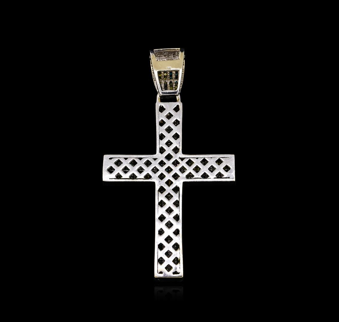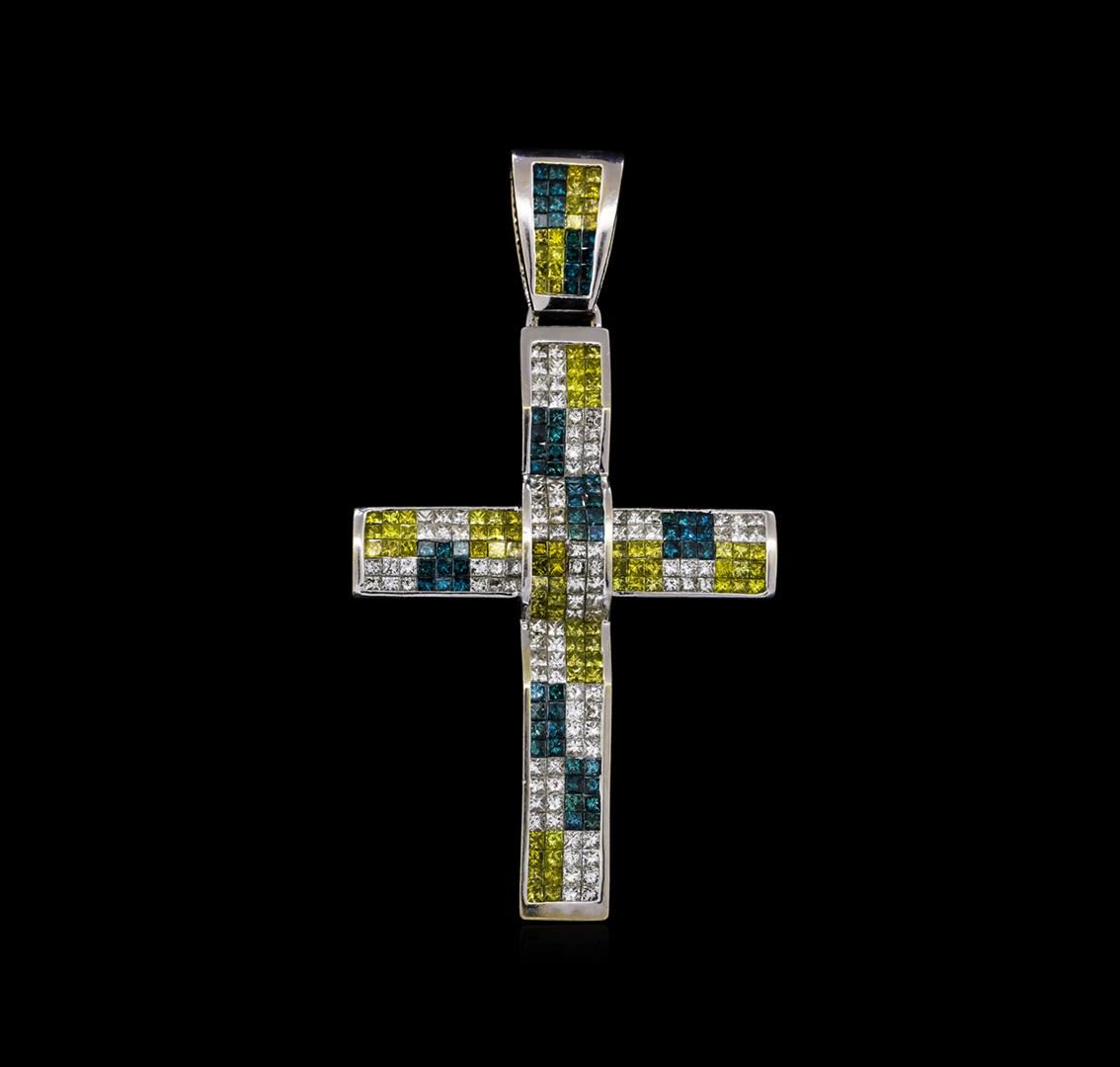 One electronically tested 14KT white gold cast & assembled diamond cross pendant. The pendant features a three and one-half inch length, one and three-quarter inch width diamond encrusted cross supported by a lattice under gallery, completed by a diamond set bail. Bright polish finish. Identified with markings of "585". Condition is good. Containing: One Hundred Four invisible set princess cut diamonds, measuring 2.10 x 1.90 x 1.33mm (depth est.) approximate total weight of 104 Stones = 4.53ct. Graded in the setting. Clarity: VS-2 to SI-2. Color: G - I Eighty-Six invisible set princess cut diamonds, measuring 2.10 x 1.90 x 1.43mm (depth est.) approximate total weight of 86 Stones = 4.02ct. Indications of laboratory enhanced color. Color grade is an average for the group. Graded in the setting. Clarity: SI-2 to I-2 Sixty-Eight invisible set princess cut diamonds, measuring 2.10 x 1.90 x 1.43mm (depth est.) approximate total weight of 68 Stones = 3.18ct. Indications of laboratory enhanced color. Color grade is an average for the group. Graded in the setting. Clarity: SI-2 to I-2. Total Weight of Diamonds 11.73ct. Total Weight of Pendant 38.44gm. AIG Appraised at $25,710.00.