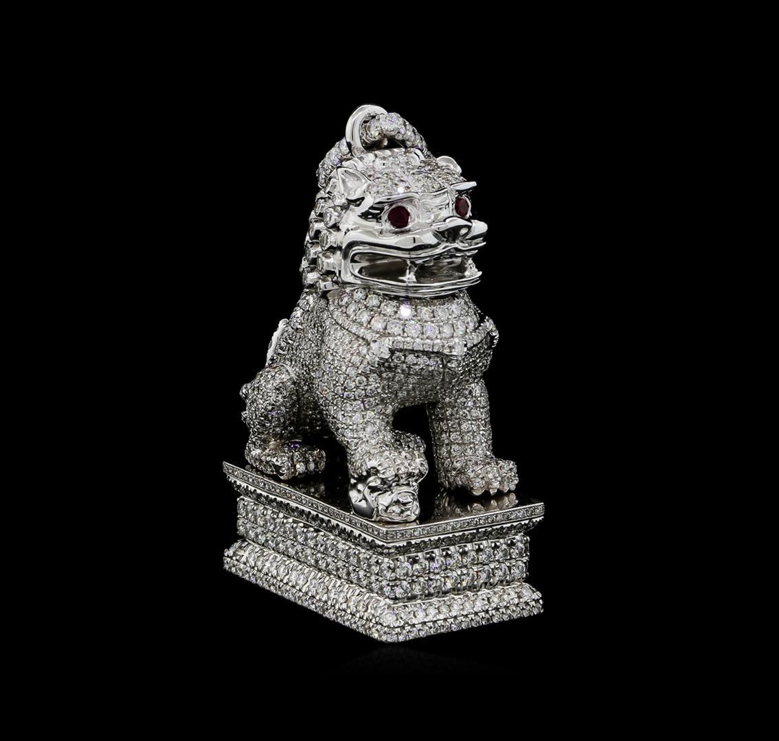 One electronically tested platinum cast & assembled diamond Chinese "Foo Dog" pendant with a bright and milgrain finish. The pendant features a Chinese "Foo Dog" motif. The body, legs, tail, and head of the foo dog are all diamond encrusted. Two rubies accent the eyes. The foo dog is placed on top of an elaborate pedestal with a lattice detailed bottom. The pendant is completed by a diamond set bail. Condition is new, good workmanship. Foo Dogs are actually lions. In China, where Foo Dogs originated thousands of years ago they are called shi meaning "lion" or shishi meaning "stone lion". Due to their resemblance to the Chow Chow and Shih Tzu they became called foo dogs in English. Foo dogs are also referred to as Chinese guardian lions, guardian dogs or stone temple dogs. Foo dogs are protective statues normally designed in pairs. One is female and the other is male. In this specific case the foo dog is female because the female dog is holding a puppy underneath her paw. It is believed that the puppy represents nature or a nurturing spirit. Condition is new, good workmanship. Containing: One Hundred Thirteen prong set round brilliant cut diamonds, measuring 2.10 - 2.00 x 1.23mm (depth est.) approximate total weight of 113 Stones = 3.66ct. Clarity: VVS-1 to VS-1. Color: F - H One Hundred Sixty-Nine prong & bezel set round brilliant cut diamonds, measuring 1.70 - 1.50 x 0.96mm (depth est.) approximate total weight of 169 Stones = 2.61ct. Graded in the setting. Clarity: VVS-1 to VS-1. Color: F - H Eight Hundred Fifty-One prong set round brilliant cut diamonds, measuring 1.40 - 1.00 x 0.72mm (depth est.) approximate total weight of 851 Stones = 5.46ct. Graded in the setting. Clarity: VVS-1 to VS-1. Color: F - H. Total Weight of Diamonds 11.73ct. Total Weight of Pendant 71.31gm. AIG Appraised at $65,690.00.