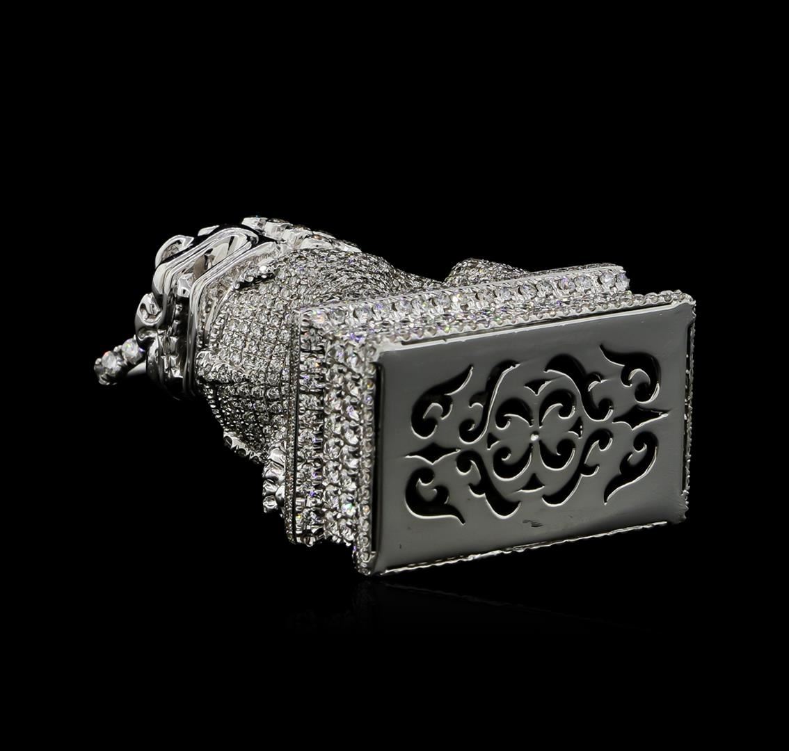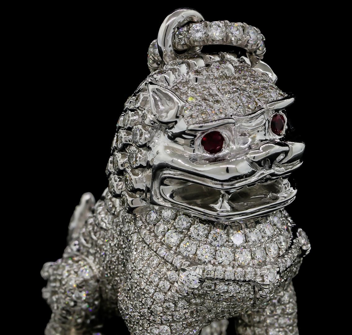 One electronically tested platinum cast & assembled diamond Chinese "Foo Dog" pendant with a bright and milgrain finish. The pendant features a Chinese "Foo Dog" motif. The body, legs, tail, and head of the foo dog are all diamond encrusted. Two rubies accent the eyes. The foo dog is placed on top of an elaborate pedestal with a lattice detailed bottom. The pendant is completed by a diamond set bail. Condition is new, good workmanship. Foo Dogs are actually lions. In China, where Foo Dogs originated thousands of years ago they are called shi meaning "lion" or shishi meaning "stone lion". Due to their resemblance to the Chow Chow and Shih Tzu they became called foo dogs in English. Foo dogs are also referred to as Chinese guardian lions, guardian dogs or stone temple dogs. Foo dogs are protective statues normally designed in pairs. One is female and the other is male. In this specific case the foo dog is female because the female dog is holding a puppy underneath her paw. It is believed that the puppy represents nature or a nurturing spirit. Condition is new, good workmanship. Containing: One Hundred Thirteen prong set round brilliant cut diamonds, measuring 2.10 - 2.00 x 1.23mm (depth est.) approximate total weight of 113 Stones = 3.66ct. Clarity: VVS-1 to VS-1. Color: F - H One Hundred Sixty-Nine prong & bezel set round brilliant cut diamonds, measuring 1.70 - 1.50 x 0.96mm (depth est.) approximate total weight of 169 Stones = 2.61ct. Graded in the setting. Clarity: VVS-1 to VS-1. Color: F - H Eight Hundred Fifty-One prong set round brilliant cut diamonds, measuring 1.40 - 1.00 x 0.72mm (depth est.) approximate total weight of 851 Stones = 5.46ct. Graded in the setting. Clarity: VVS-1 to VS-1. Color: F - H. Total Weight of Diamonds 11.73ct. Total Weight of Pendant 71.31gm. AIG Appraised at $65,690.00.