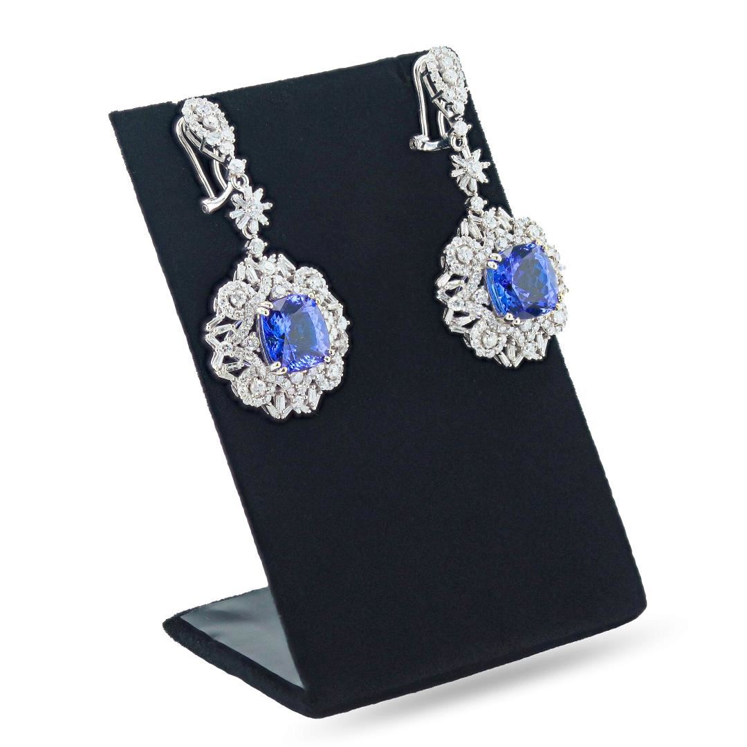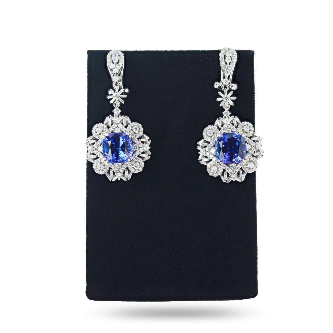 Fourteen karat (14K) white gold natural tanzanite zoisite and diamond earrings. Two (2) cushion brilliant cut natural tanzanite zoisite gemstones are mounted in the center of the earrings. Round brilliant and baguette cut diamonds accent the earrings around the center gemstones. The earrings have a gross weight of 14.4 Grams. #NATURAL GEMSTONE# GEMSTONE: Tanzanite Zoisite; NATURE: Natural; SHAPE: Cushion Brilliant, Faceted Cut; WEIGHT: 11.75 carat total (2pcs.); DIMENSIONS: 10.66 x 10.58 / 10.45 x 10.39mm; CLARITY: Type 1; Color: Bluish Violet (5/5); SYMMETRY: Excellent; COLOR INTENSITY: Intense; TRANSPARENCY: Transparent; TONE: Dark #NATURAL DIAMOND# SHAPE: Round Brilliant and Baguette Cut; WEIGHT: 3.98 carat total (RB-164pcs., B-32pcs.); DIMENSIONS: 2.3 x 1.0mm; AVERAGE CLARITY: VS1-SI1; AVERAGE COLOR: G-H; SYMMETRY: Excellent; POLISH: Excellent #METAL# METAL: Gold; PURITY: 14K; COOLOR: White; CONDITION: Excellent; FINISH: High Polish
