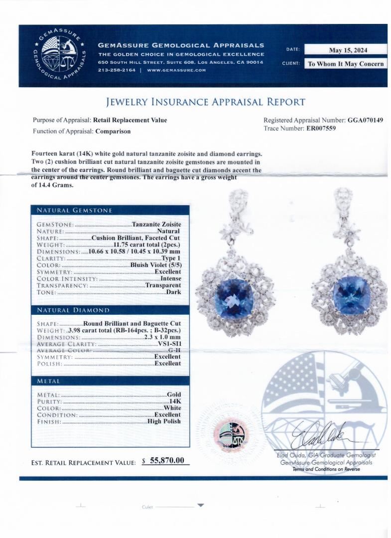 Fourteen karat (14K) white gold natural tanzanite zoisite and diamond earrings. Two (2) cushion brilliant cut natural tanzanite zoisite gemstones are mounted in the center of the earrings. Round brilliant and baguette cut diamonds accent the earrings around the center gemstones. The earrings have a gross weight of 14.4 Grams. #NATURAL GEMSTONE# GEMSTONE: Tanzanite Zoisite; NATURE: Natural; SHAPE: Cushion Brilliant, Faceted Cut; WEIGHT: 11.75 carat total (2pcs.); DIMENSIONS: 10.66 x 10.58 / 10.45 x 10.39mm; CLARITY: Type 1; Color: Bluish Violet (5/5); SYMMETRY: Excellent; COLOR INTENSITY: Intense; TRANSPARENCY: Transparent; TONE: Dark #NATURAL DIAMOND# SHAPE: Round Brilliant and Baguette Cut; WEIGHT: 3.98 carat total (RB-164pcs., B-32pcs.); DIMENSIONS: 2.3 x 1.0mm; AVERAGE CLARITY: VS1-SI1; AVERAGE COLOR: G-H; SYMMETRY: Excellent; POLISH: Excellent #METAL# METAL: Gold; PURITY: 14K; COOLOR: White; CONDITION: Excellent; FINISH: High Polish