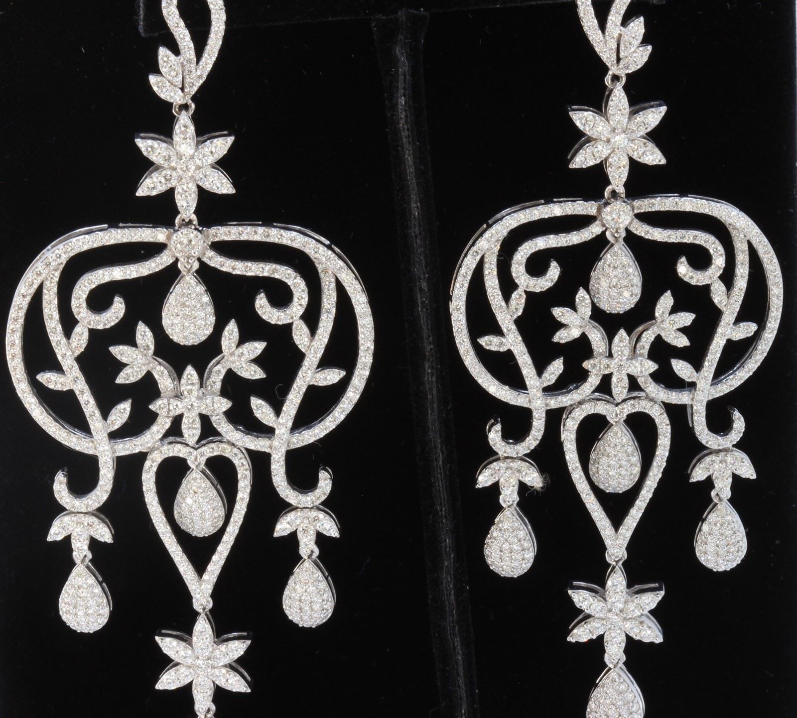14K WHITE GOLD DIAMOND EARRING:41.43 GRAMS/DIAMOND:11.75CT/#GVE1180 **Delicately mounted in 14k white gold, twinkling scrolls of 11.75ct round brilliant cut diamonds are set in a motif of flowers and vines. Diamonds are long known to emit radiance and sovereignty, adding to this piece a unique embrace of divinity sent to sweep imaginations. **