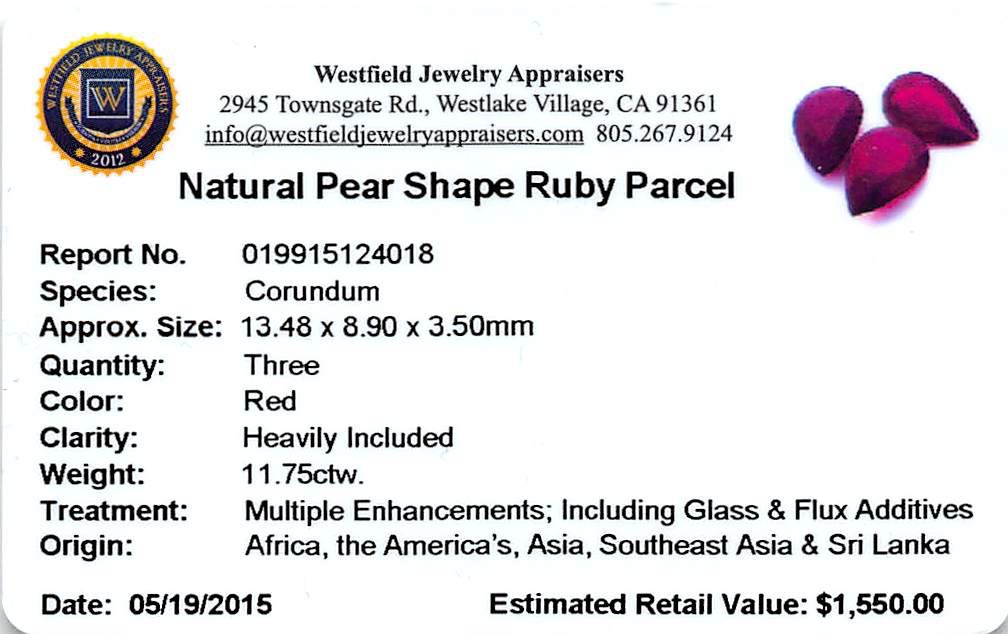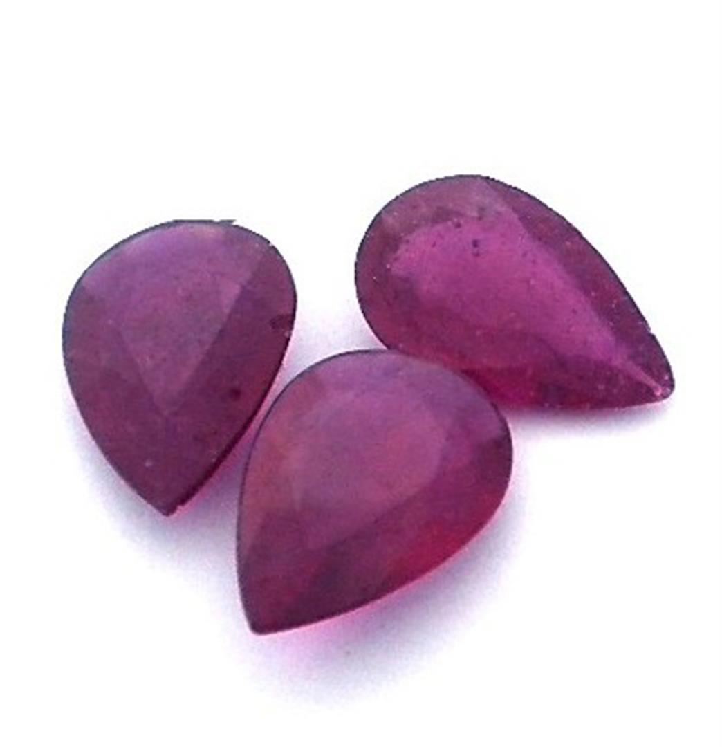 Three pear mixed cut natural rubies, measuring 13.48 x 8.90 x 3.50mm, exact total weight 11.75ct., clarity is heavily included, type II, dark, very slightly brownish, red color, (GIA R 7/3), cut is good. Measurements are an average for the group. Transmitting light somewhat diffusely, transparent to translucent. Naturally occurring internal & external characteristics are present. Indications of laboratory high temperature heat treatment, with glass & flux additives. Westfield Appraised at $1,550.00.