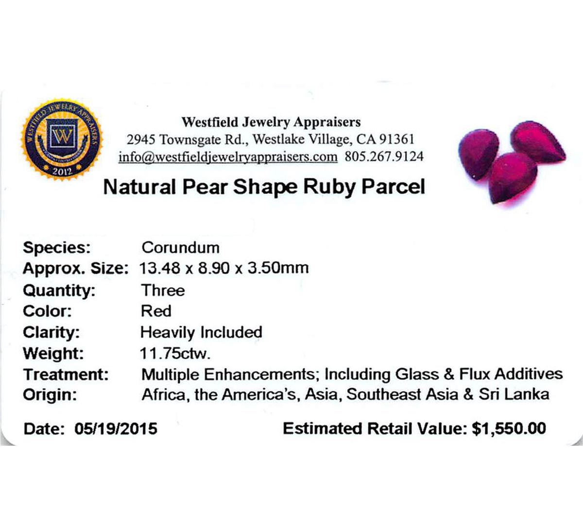 Three pear mixed cut natural rubies, measuring 13.48 x 8.90 x 3.50mm, exact total weight 11.75ct., clarity is heavily included, type II, dark, very slightly brownish, red color, (GIA R 7/3), cut is good. Measurements are an average for the group. Transmitting light somewhat diffusely, transparent to translucent. Naturally occurring internal & external characteristics are present. Indications of laboratory high temperature heat treatment, with glass & flux additives. Westfield Appraised at $1,550.00.