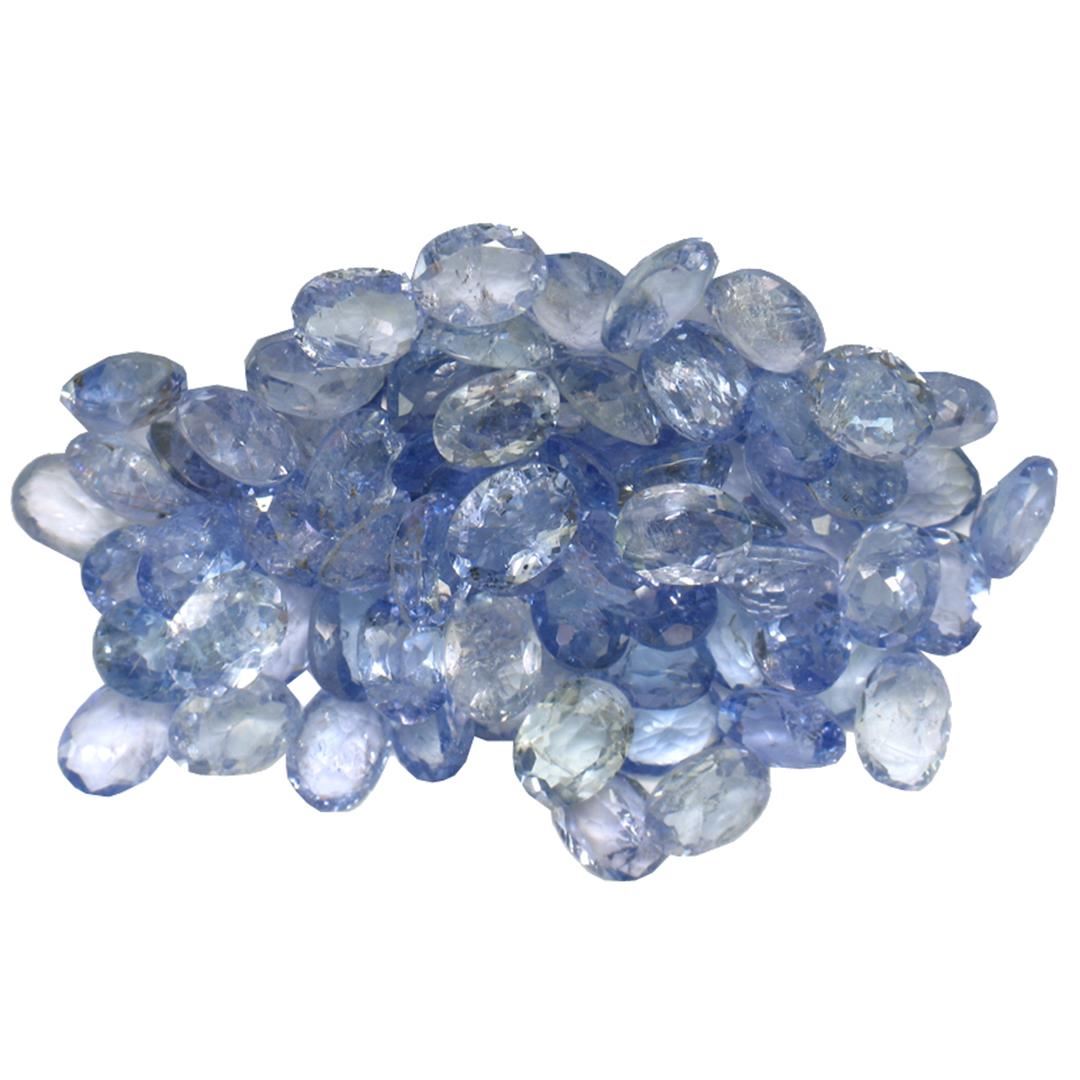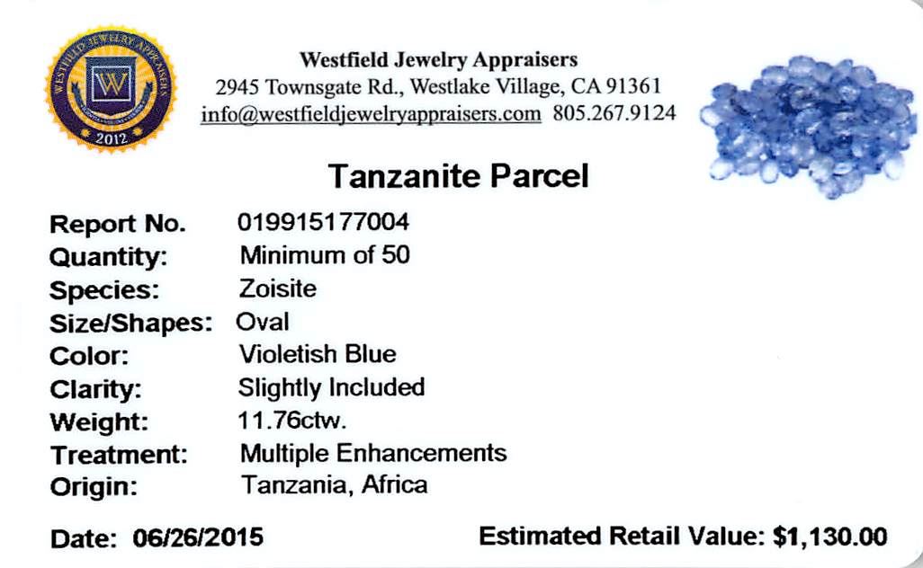 Fifty oval mixed cut natural tanzanites, measuring 4.00 x 3.00 x 1.95mm, exact total weight 11.76ct., clarity is slightly included, type I, medium, very slightly grayish, violetish blue color, (GIA vB 5/3), cut is good. Measurements & the color grade Westfield Appraised at $1,130.00.