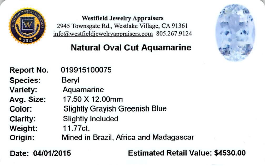 One oval cut natural aquamarine exact weight 11.77ct., clarity is slightly included, type I, medium light, very slightly grayish, very slightly greenish blue color, (GIA vslgB 4/3), cut is good. Westfield Appraised at $4,530.00.