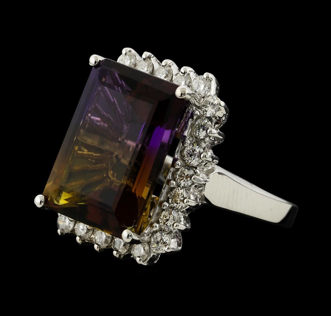 One electronically tested 14KT white gold lady's cast fashion ring with a cathedral shank with a basket halo with a bright polish finish. The featured lady's ring has a shank measuring 2.30 millimeters wide. Identified with markings of '14K'. Condition is new, good workmanship. Containing: One prong set emerald standard step cut natural ametrine quartz, measuring 16.25 x 12.35 x 8.25mm, (depth est.) approximate weight of 11.78ct., clarity is eye clean, medium dark, moderately strong, purple color, (GIA P 6/4) to medium light, moderately strong, orangy yellow, (GIA oY 4/4), cut is very good. Transmitting light with no distortion, transparent. Indications of laboratory high temperature heat treatment. Colored gemstones are presumed to have been subjected to commonly used enhancement processes. Graded in the setting. Twenty-Four prong set round brilliant cut diamonds, measuring 2.30 - 2.20 x 1.35mm (depth est.) approximate total weight of 24 Stones = 1.00ct. Graded in the setting. Clarity SI-1 to I-1. Color: F - G Cut Good. Total Weight of Colored Stones 11.78ct.. Total Weight of Diamonds 1.00ct.. Total Weight of Ring 9.90gm. GAS Appraised at $4,195.00.