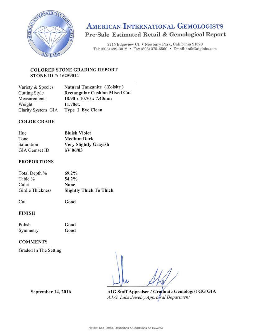 One electronically tested 14KT white gold ladies cast tanzanite and diamond ring with a bright polish finish. The featured tanzanite is set between tiered diamond ribbons, completed by a two millimeter wide band. Identified with markings of 'K14'. Condition is new, good workmanship. Containing: One prong set rectangular cushion mixed cut natural tanzanite, measuring 18.90 x 10.70 x 7.40mm, approximate weight of 11.78ct., clarity is eye clean, type I, medium dark, very slightly grayish, bluish violet color, (GIA bV 6/3), cut is good. Transmitting light with no distortion, transparent. Colored Stone Grading Report attached. Graded in the setting. Tanzanite is a very rare gemstone that is only found in the country of Tanzania. Originally discovered in 1967. Tiffany & Company, named the stone Tanzanite. It is found in the Usumburu Mountains that border the Umba Valley of northern Tanzania. Tanzanite occurs in gray, brown, violet, blue, reddish-purple, & green. The gem is interesting because of its exceptional pleochroism. Rotated in different directions a tanzanite will exhibit multiple changes of color. Tanzanite has a low tolerance to ultrasonic cleaning, and should not be cleaned using this method. Thirty-Six prong set round brilliant cut diamonds, measuring 1.80 - 1.80 x 1.08mm (depth est.) approximate total weight of 36 Stones = 0.87ct. Graded in the setting. Clarity SI-2 to I-2. Color: F - H. Total Weight of Colored Stones 11.78ct.. Total Weight of Diamonds 0.87ct.. Total Weight of Ring 10.18gm. AIG Appraised at $30,425.00.