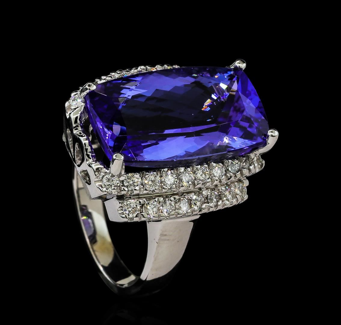 One electronically tested 14KT white gold ladies cast tanzanite and diamond ring with a bright polish finish. The featured tanzanite is set between tiered diamond ribbons, completed by a two millimeter wide band. Identified with markings of 'K14'. Condition is new, good workmanship. Containing: One prong set rectangular cushion mixed cut natural tanzanite, measuring 18.90 x 10.70 x 7.40mm, approximate weight of 11.78ct., clarity is eye clean, type I, medium dark, very slightly grayish, bluish violet color, (GIA bV 6/3), cut is good. Transmitting light with no distortion, transparent. Colored Stone Grading Report attached. Graded in the setting. Tanzanite is a very rare gemstone that is only found in the country of Tanzania. Originally discovered in 1967. Tiffany & Company, named the stone Tanzanite. It is found in the Usumburu Mountains that border the Umba Valley of northern Tanzania. Tanzanite occurs in gray, brown, violet, blue, reddish-purple, & green. The gem is interesting because of its exceptional pleochroism. Rotated in different directions a tanzanite will exhibit multiple changes of color. Tanzanite has a low tolerance to ultrasonic cleaning, and should not be cleaned using this method. Thirty-Six prong set round brilliant cut diamonds, measuring 1.80 - 1.80 x 1.08mm (depth est.) approximate total weight of 36 Stones = 0.87ct. Graded in the setting. Clarity SI-2 to I-2. Color: F - H. Total Weight of Colored Stones 11.78ct.. Total Weight of Diamonds 0.87ct.. Total Weight of Ring 10.18gm. AIG Appraised at $30,425.00.