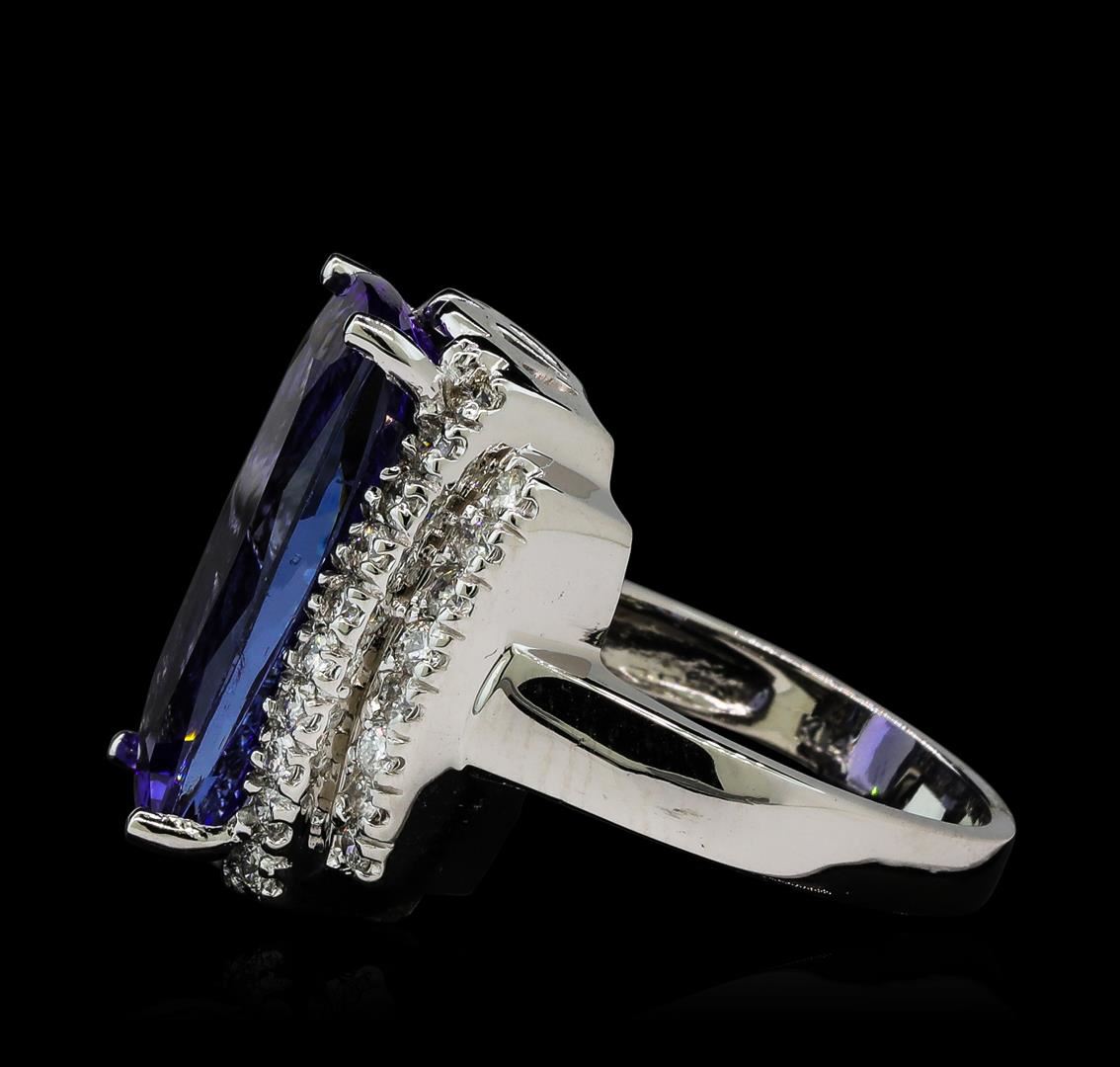 One electronically tested 14KT white gold ladies cast tanzanite and diamond ring with a bright polish finish. The featured tanzanite is set between tiered diamond ribbons, completed by a two millimeter wide band. Identified with markings of 'K14'. Condition is new, good workmanship. Containing: One prong set rectangular cushion mixed cut natural tanzanite, measuring 18.90 x 10.70 x 7.40mm, approximate weight of 11.78ct., clarity is eye clean, type I, medium dark, very slightly grayish, bluish violet color, (GIA bV 6/3), cut is good. Transmitting light with no distortion, transparent. Colored Stone Grading Report attached. Graded in the setting. Tanzanite is a very rare gemstone that is only found in the country of Tanzania. Originally discovered in 1967. Tiffany & Company, named the stone Tanzanite. It is found in the Usumburu Mountains that border the Umba Valley of northern Tanzania. Tanzanite occurs in gray, brown, violet, blue, reddish-purple, & green. The gem is interesting because of its exceptional pleochroism. Rotated in different directions a tanzanite will exhibit multiple changes of color. Tanzanite has a low tolerance to ultrasonic cleaning, and should not be cleaned using this method. Thirty-Six prong set round brilliant cut diamonds, measuring 1.80 - 1.80 x 1.08mm (depth est.) approximate total weight of 36 Stones = 0.87ct. Graded in the setting. Clarity SI-2 to I-2. Color: F - H. Total Weight of Colored Stones 11.78ct.. Total Weight of Diamonds 0.87ct.. Total Weight of Ring 10.18gm. AIG Appraised at $30,425.00.