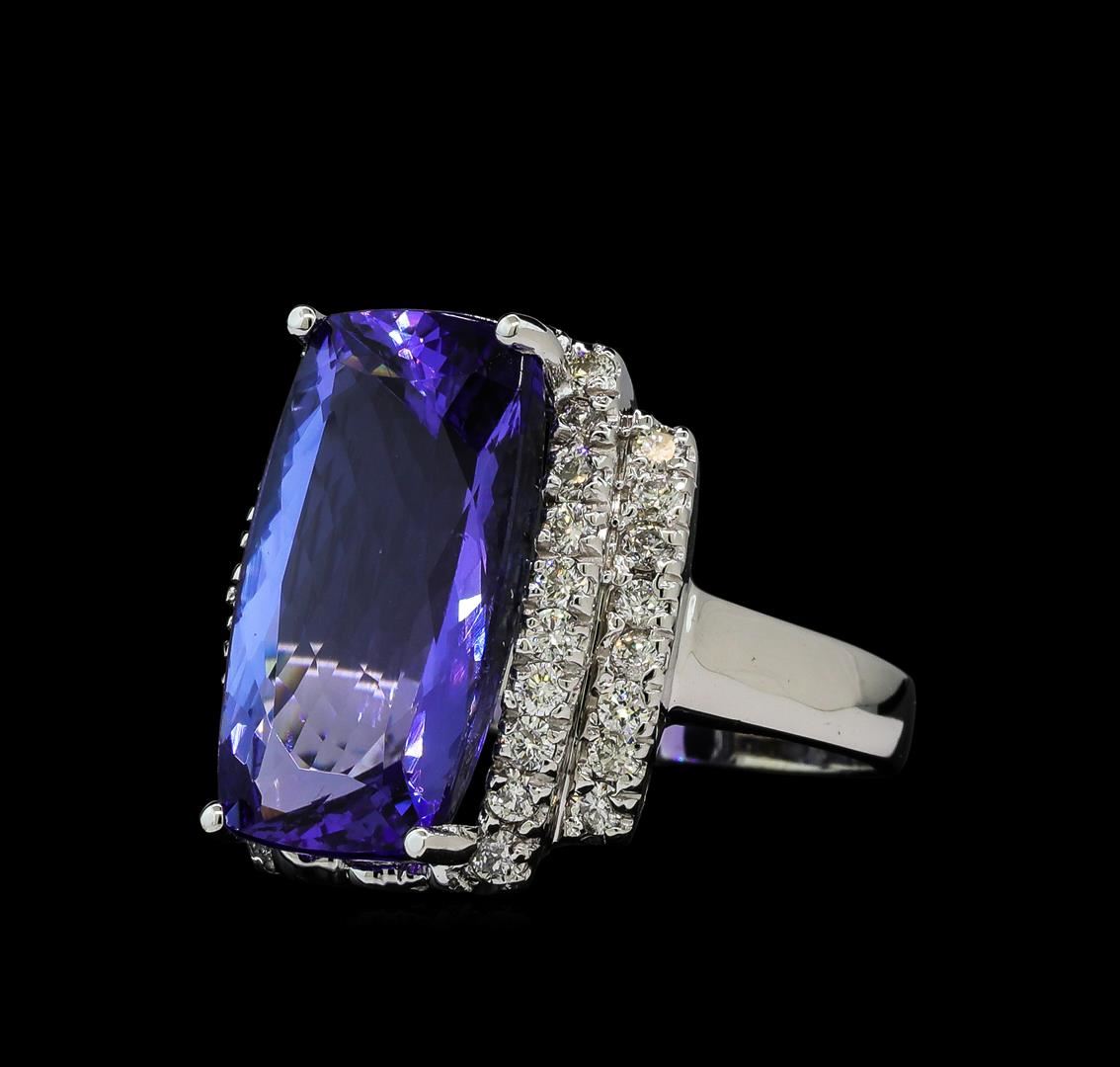 One electronically tested 14KT white gold ladies cast tanzanite and diamond ring with a bright polish finish. The featured tanzanite is set between tiered diamond ribbons, completed by a two millimeter wide band. Identified with markings of 'K14'. Condition is new, good workmanship. Containing: One prong set rectangular cushion mixed cut natural tanzanite, measuring 18.90 x 10.70 x 7.40mm, approximate weight of 11.78ct., clarity is eye clean, type I, medium dark, very slightly grayish, bluish violet color, (GIA bV 6/3), cut is good. Transmitting light with no distortion, transparent. Colored Stone Grading Report attached. Graded in the setting. Tanzanite is a very rare gemstone that is only found in the country of Tanzania. Originally discovered in 1967. Tiffany & Company, named the stone Tanzanite. It is found in the Usumburu Mountains that border the Umba Valley of northern Tanzania. Tanzanite occurs in gray, brown, violet, blue, reddish-purple, & green. The gem is interesting because of its exceptional pleochroism. Rotated in different directions a tanzanite will exhibit multiple changes of color. Tanzanite has a low tolerance to ultrasonic cleaning, and should not be cleaned using this method. Thirty-Six prong set round brilliant cut diamonds, measuring 1.80 - 1.80 x 1.08mm (depth est.) approximate total weight of 36 Stones = 0.87ct. Graded in the setting. Clarity SI-2 to I-2. Color: F - H. Total Weight of Colored Stones 11.78ct.. Total Weight of Diamonds 0.87ct.. Total Weight of Ring 10.18gm. AIG Appraised at $30,425.00.