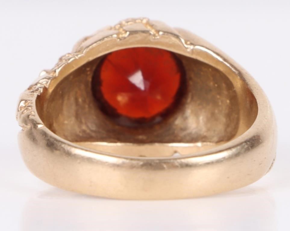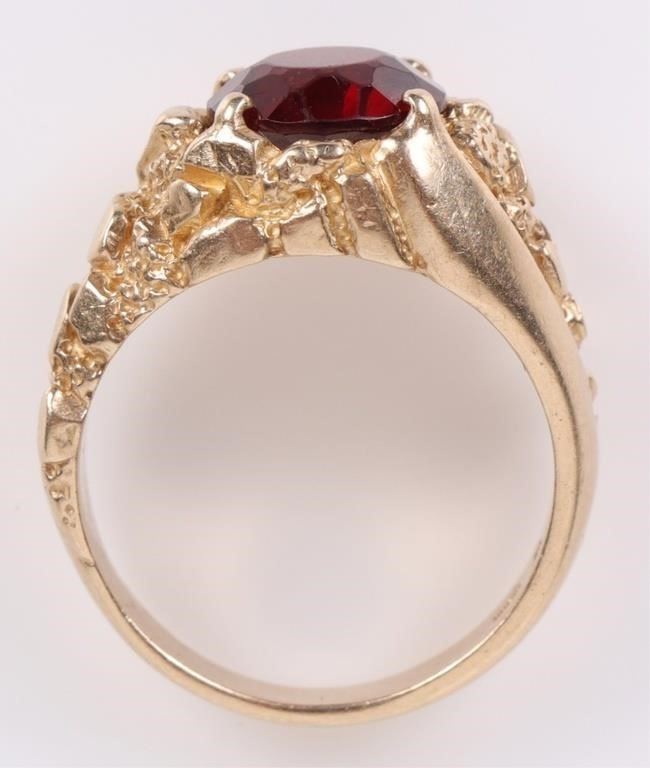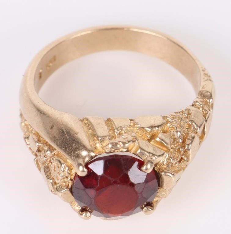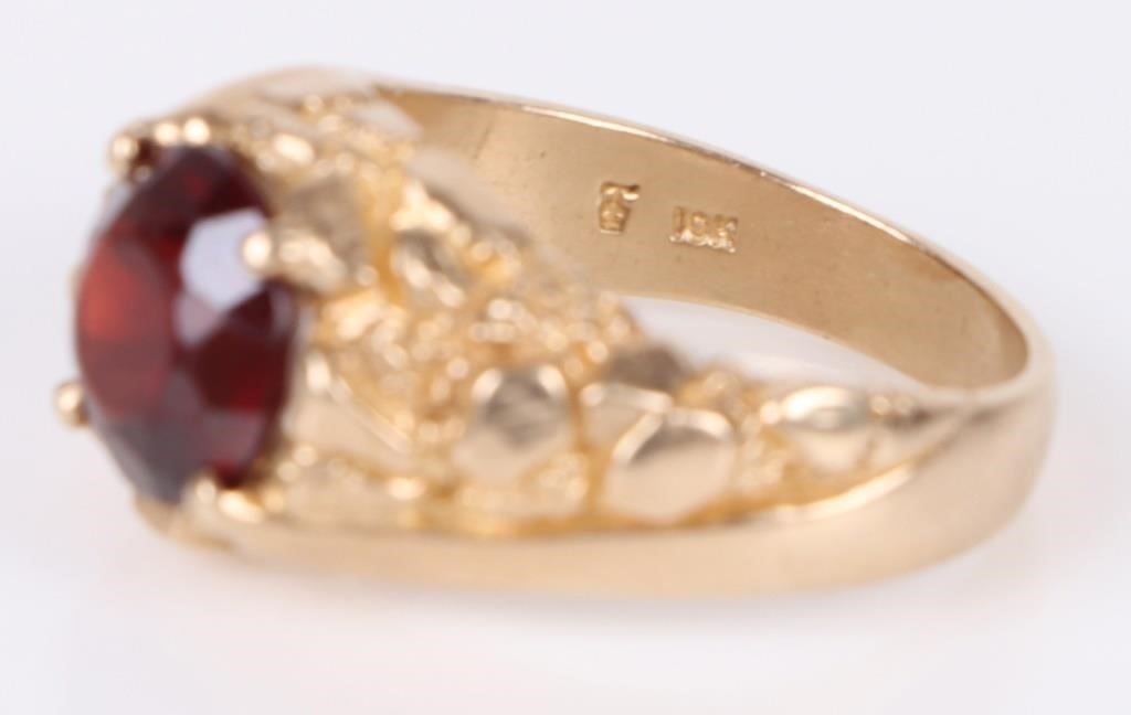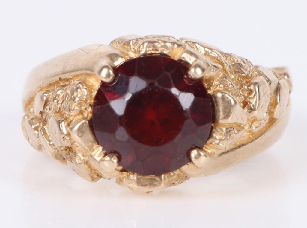 11.8 gram 10k men's ring with 4ct round cut garnet gemstone. Nugget design.